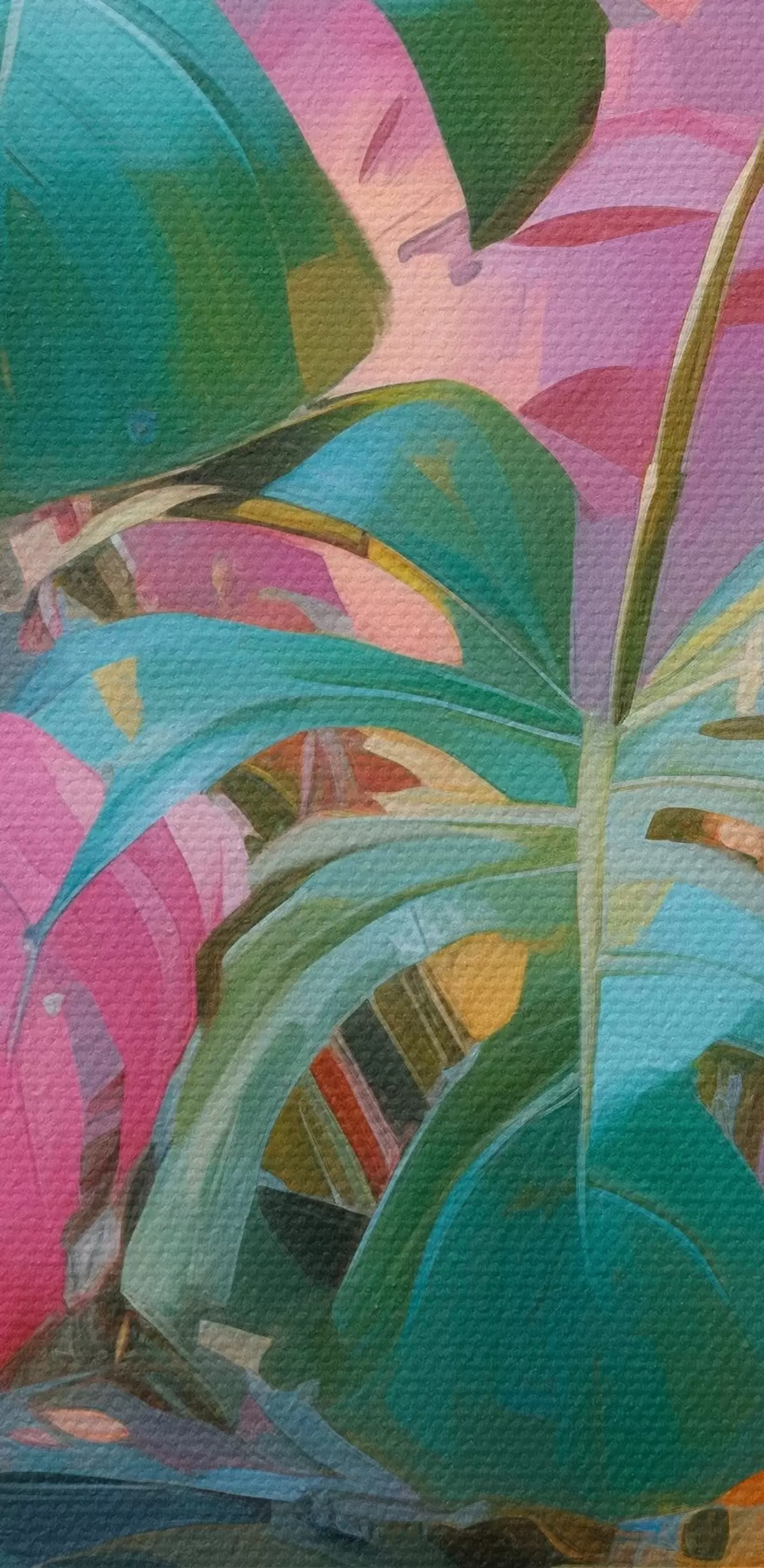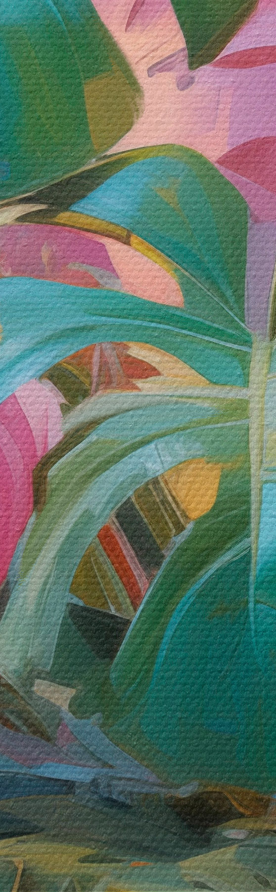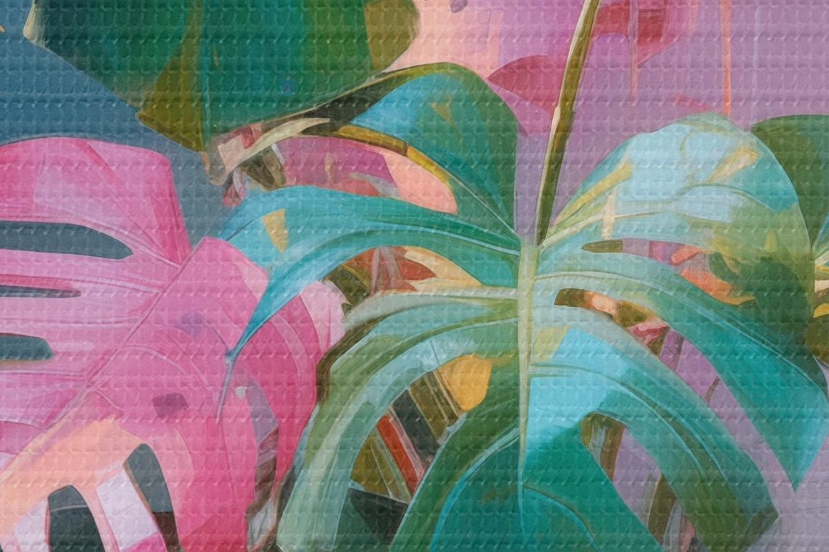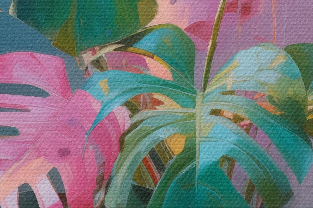 Afbeelding Abstracte monstera-plant met roze en groene bladeren, levendige kleuren, tegen een wazige achtergrond Nr r46287