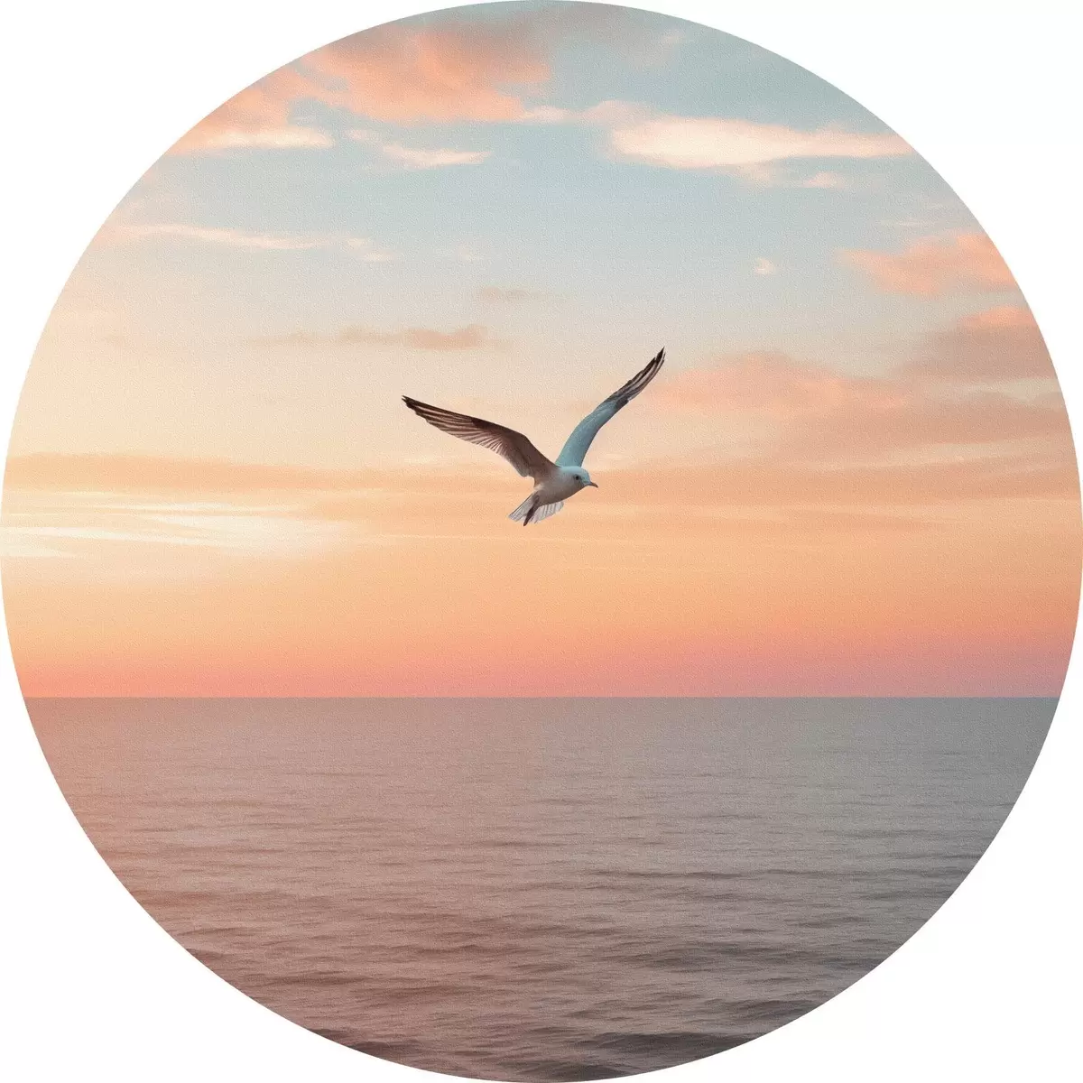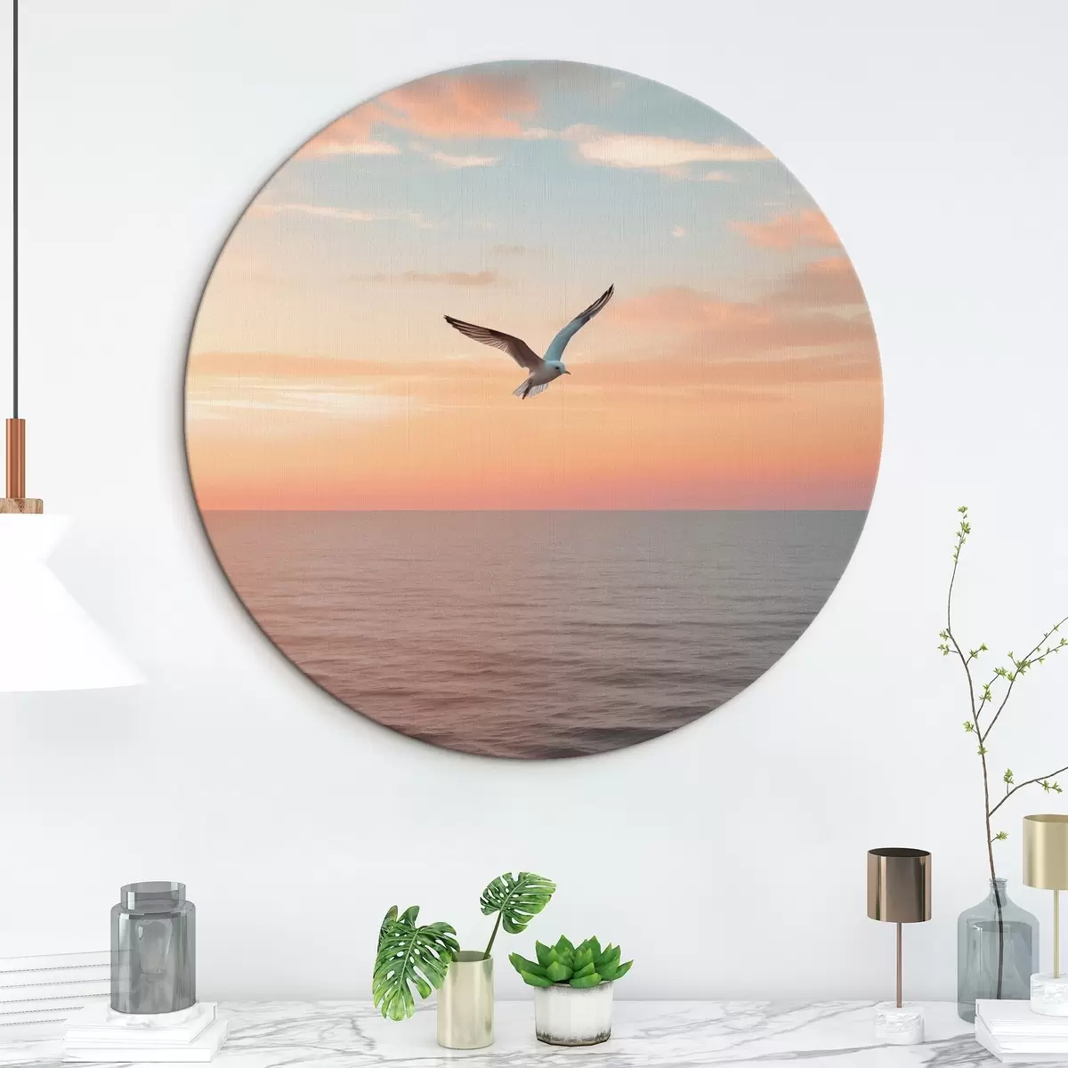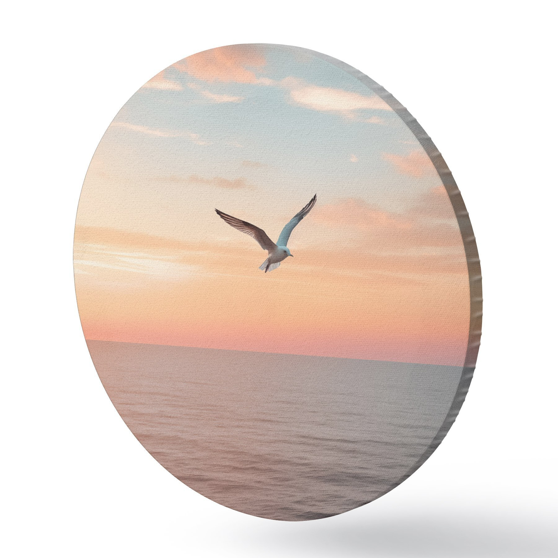 Ronde schilderijen Meeuw boven de zee bij een roze-perzikkleurige zonsondergang r46520