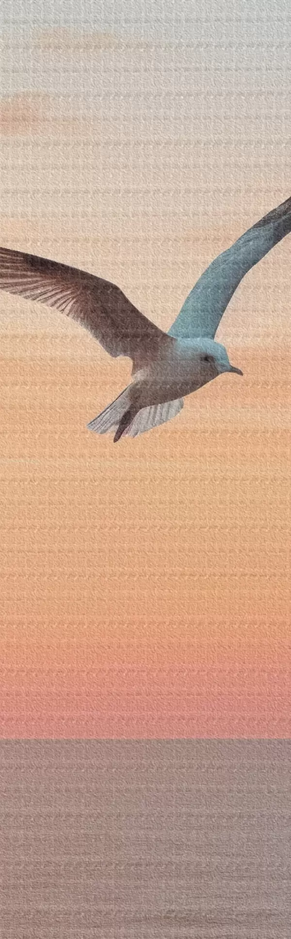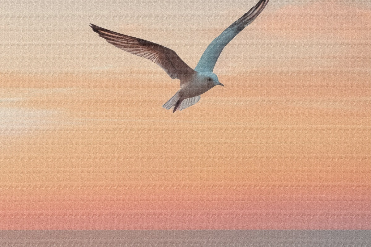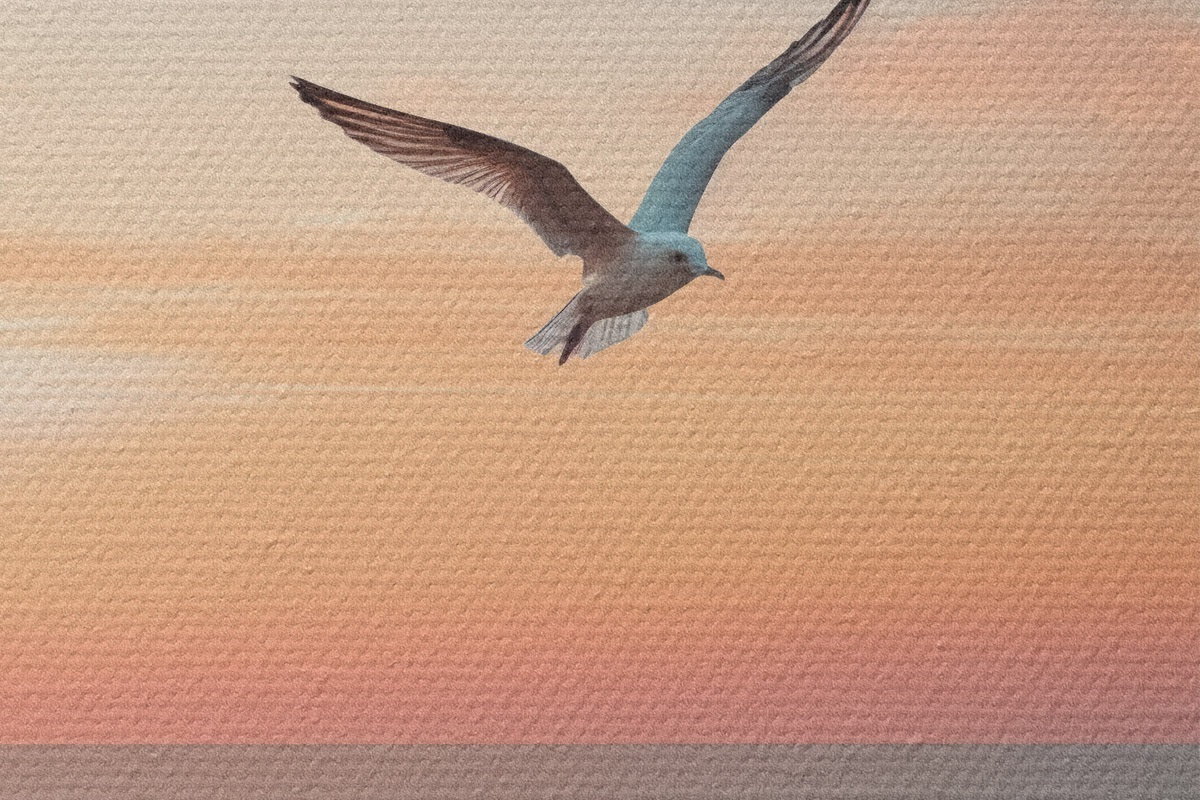 Afbeelding Meeuw boven de zee bij een roze-perzikkleurige zonsondergang Nr r46520