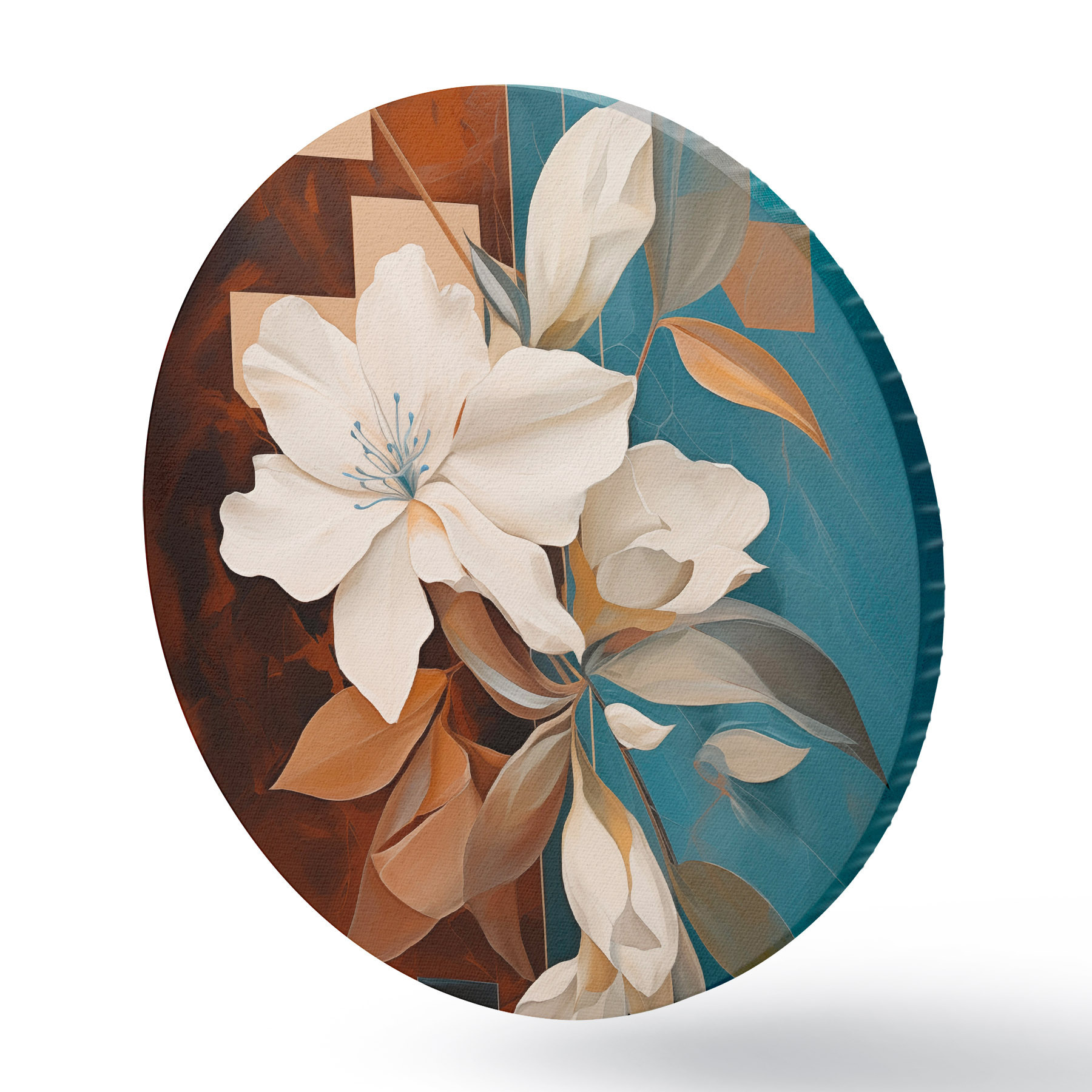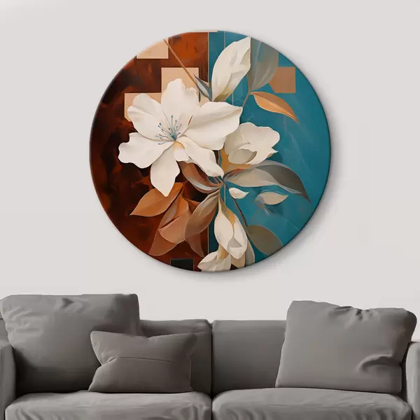 Ronde schilderijen Abstracte witte bloemen en bladeren tegen een achtergrond van bruin en blauw met abstracte vormen, in een minimalistische stijl r46709