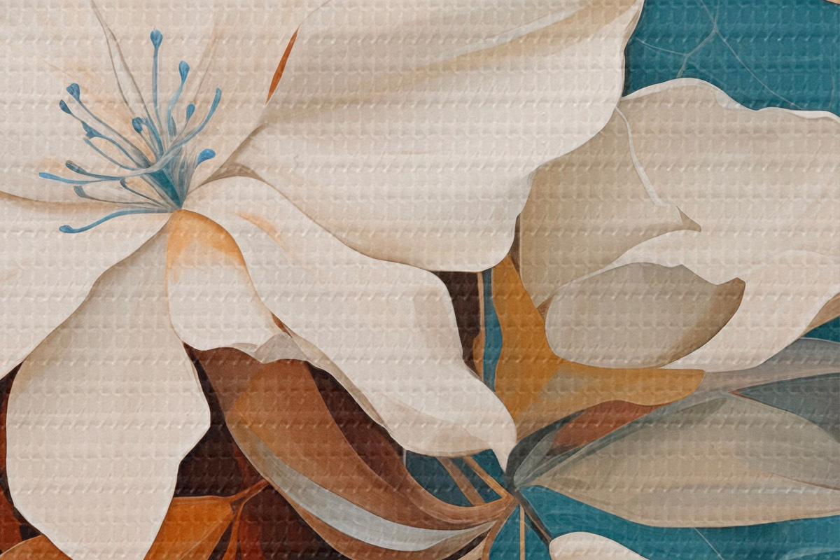 Afbeelding Abstracte witte bloemen en bladeren tegen een achtergrond van bruin en blauw met abstracte vormen, in een minimalistische stijl Nr r46709
