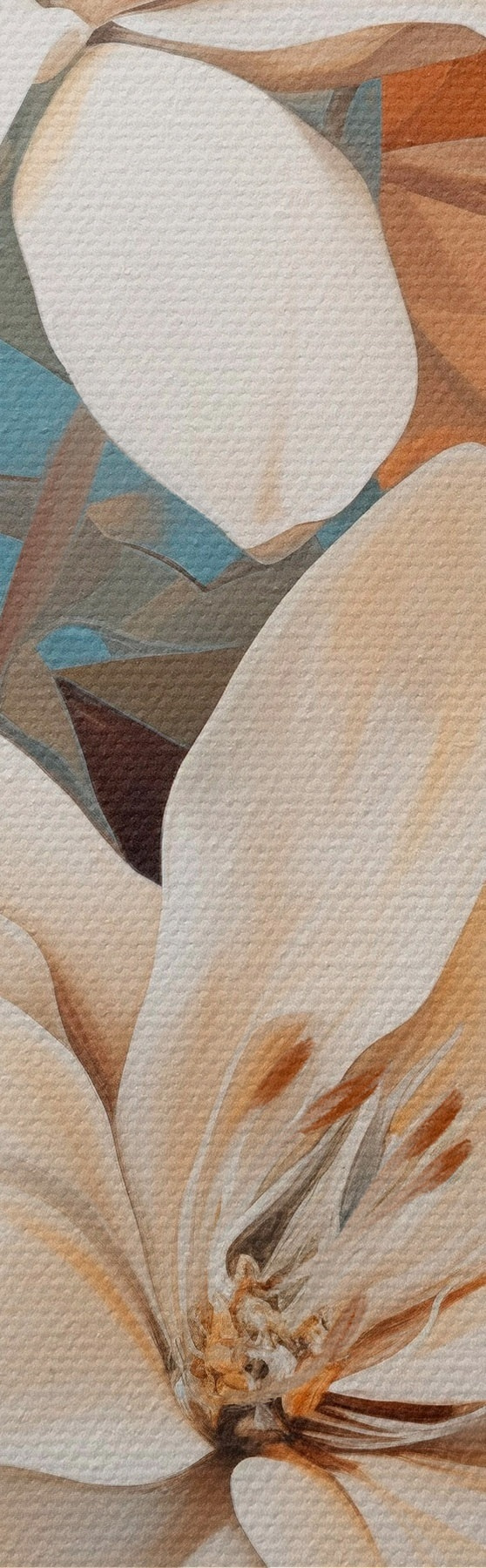 Afbeelding Abstracte witte bloemen en bladeren tegen een achtergrond van bruin en blauw met abstracte vormen, in een minimalistische stijl Nr r46710