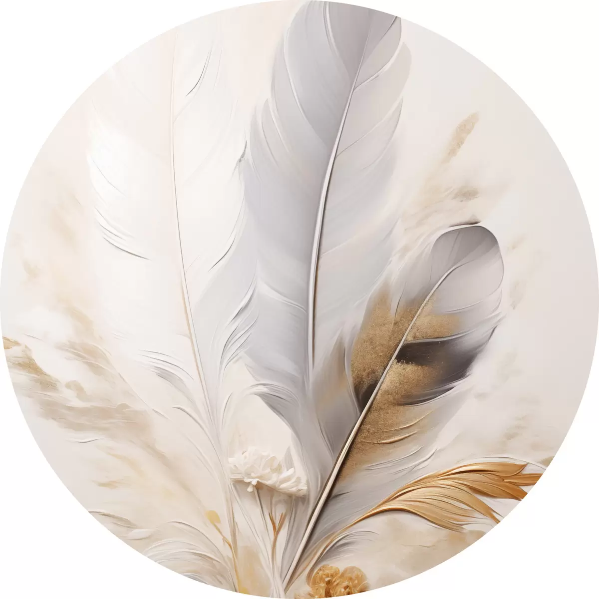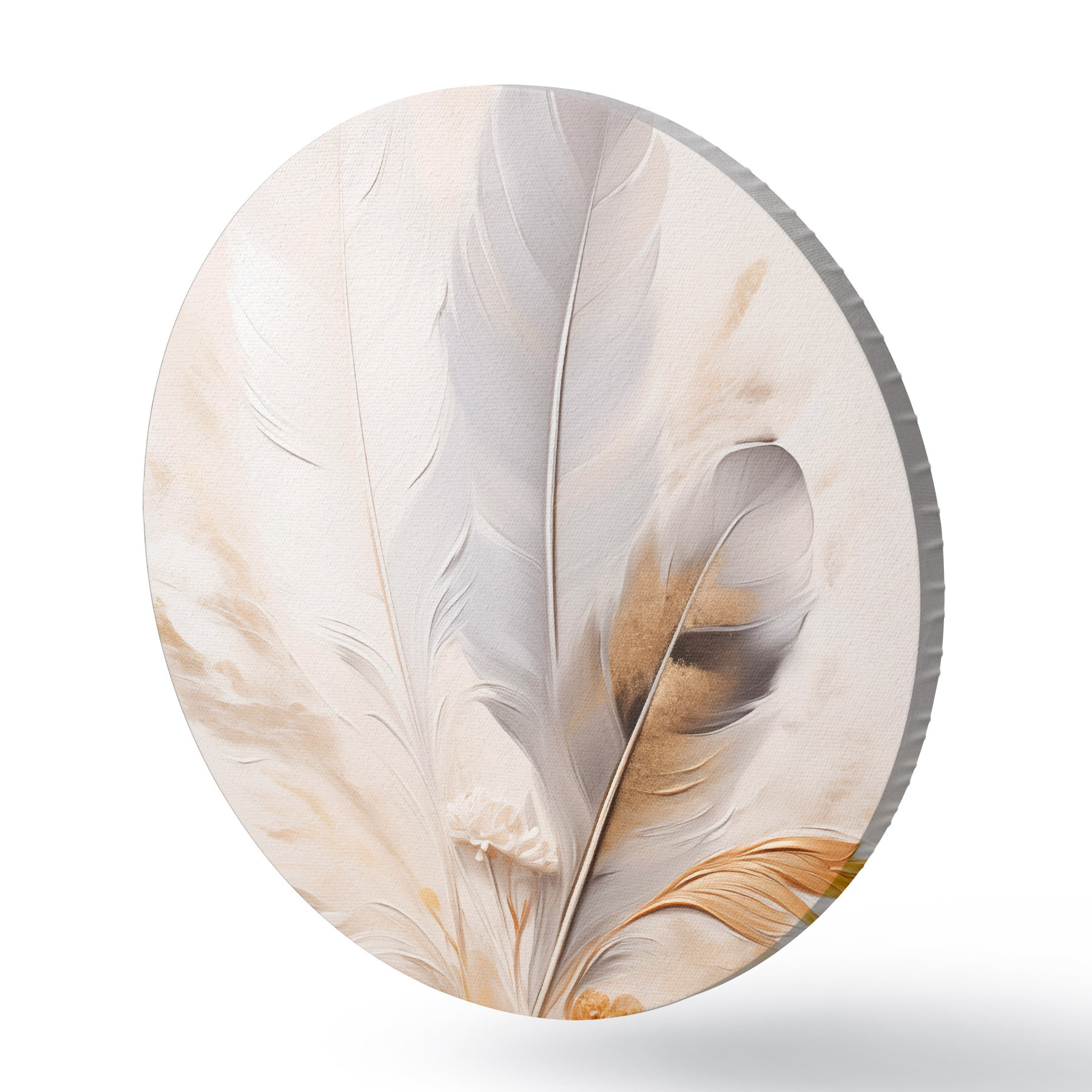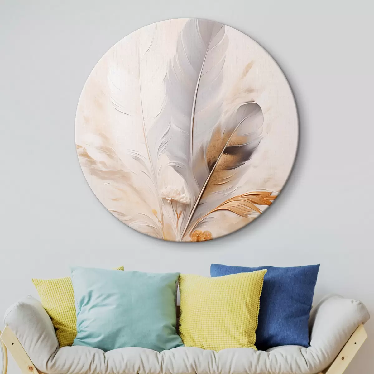 Ronde schilderijen Abstracte veren, omgeven door beige en bruine pluimen, zacht en delicaat, op een lichtbeige achtergrond r46712