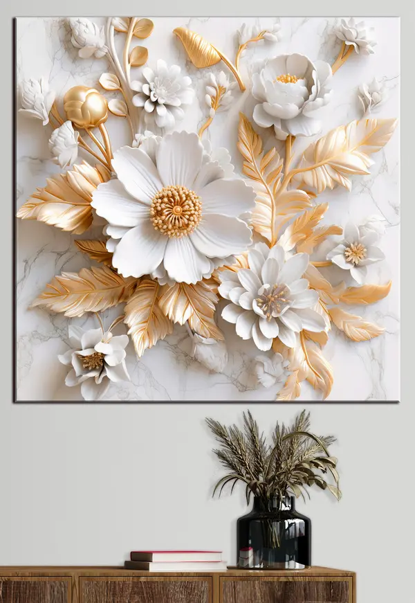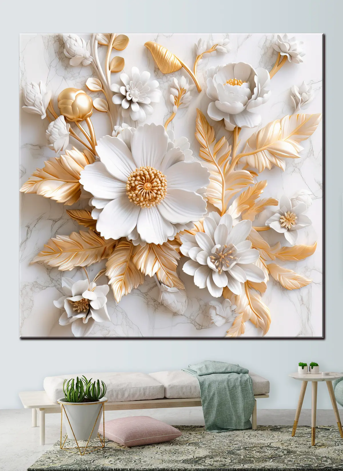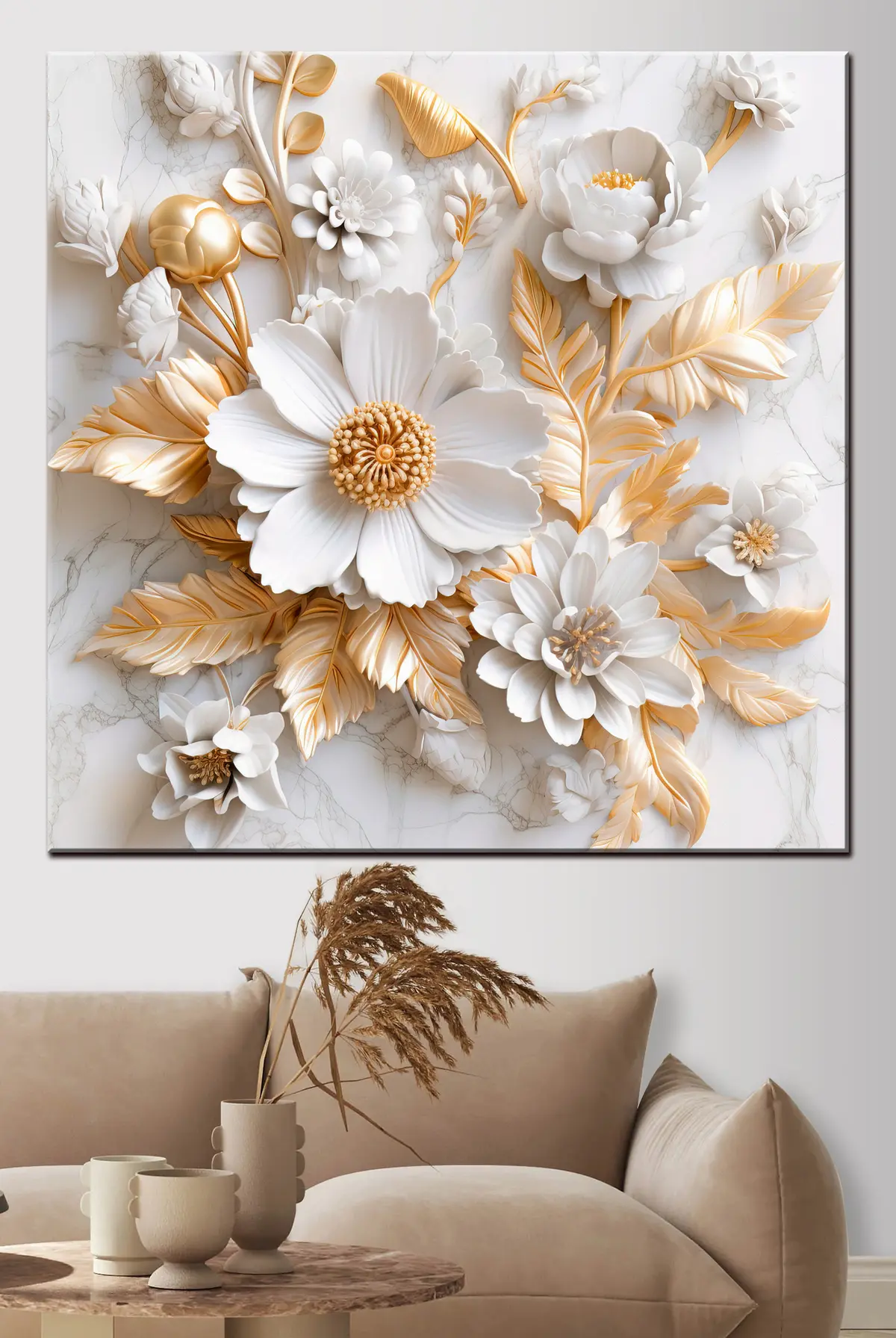 Schilderij 3D bloemen op wit marmer Art. s32778