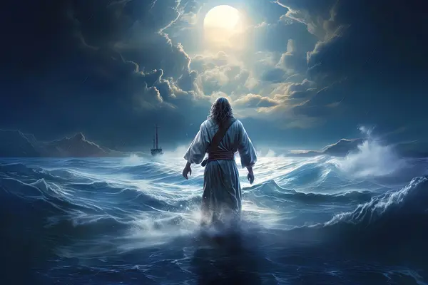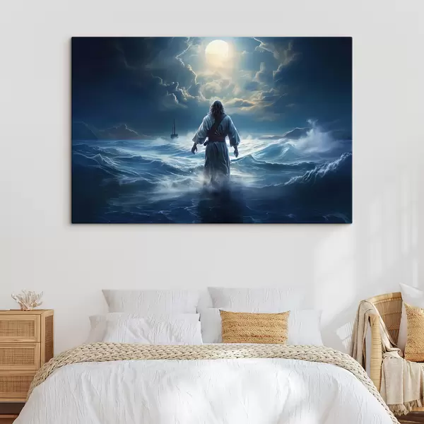 Schilderij Jezus Christus loopt over het water van een stormachtige zee naar de boot Art. s35357