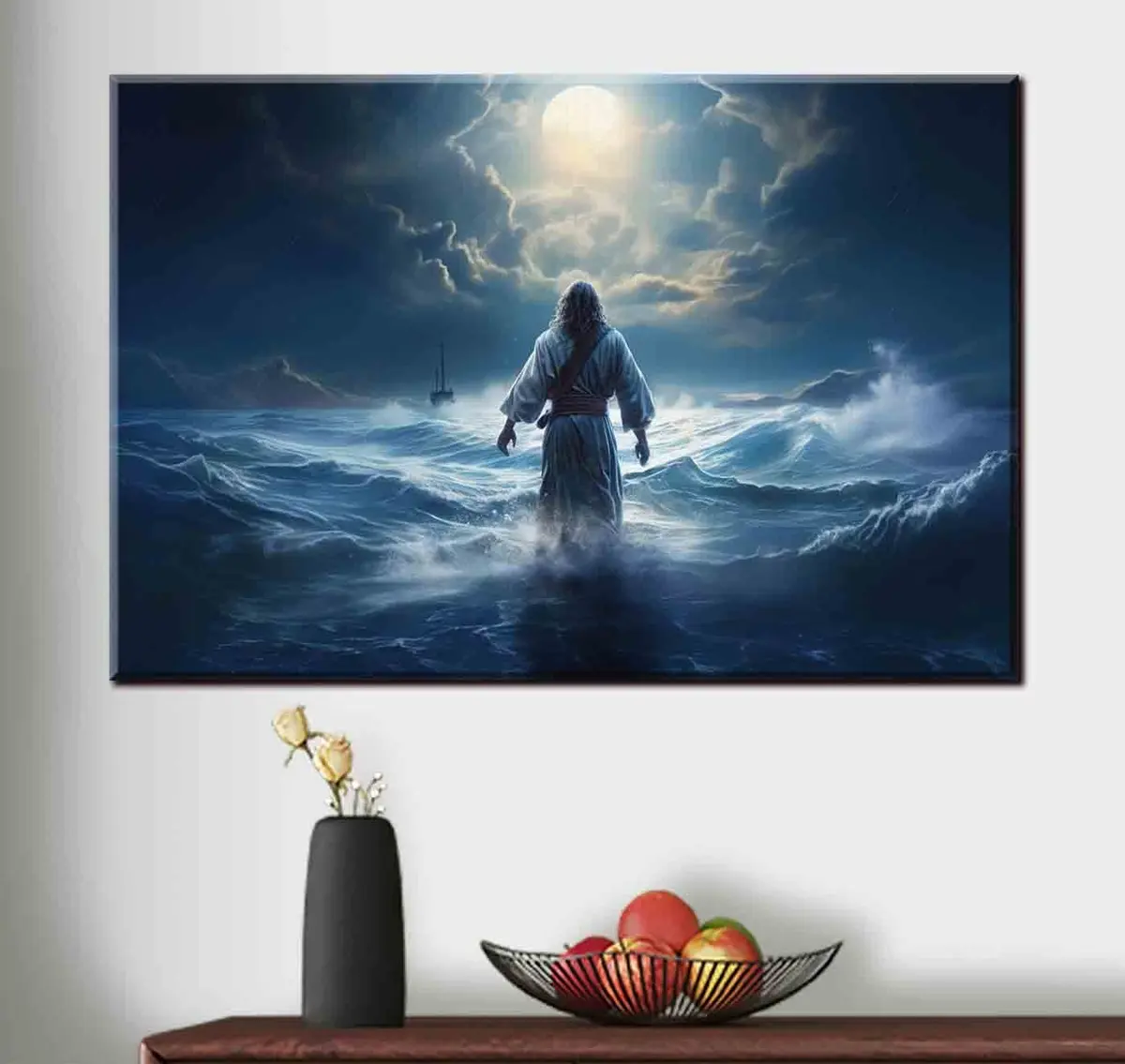 Schilderij Jezus Christus loopt over het water van een stormachtige zee naar de boot Art. s35357