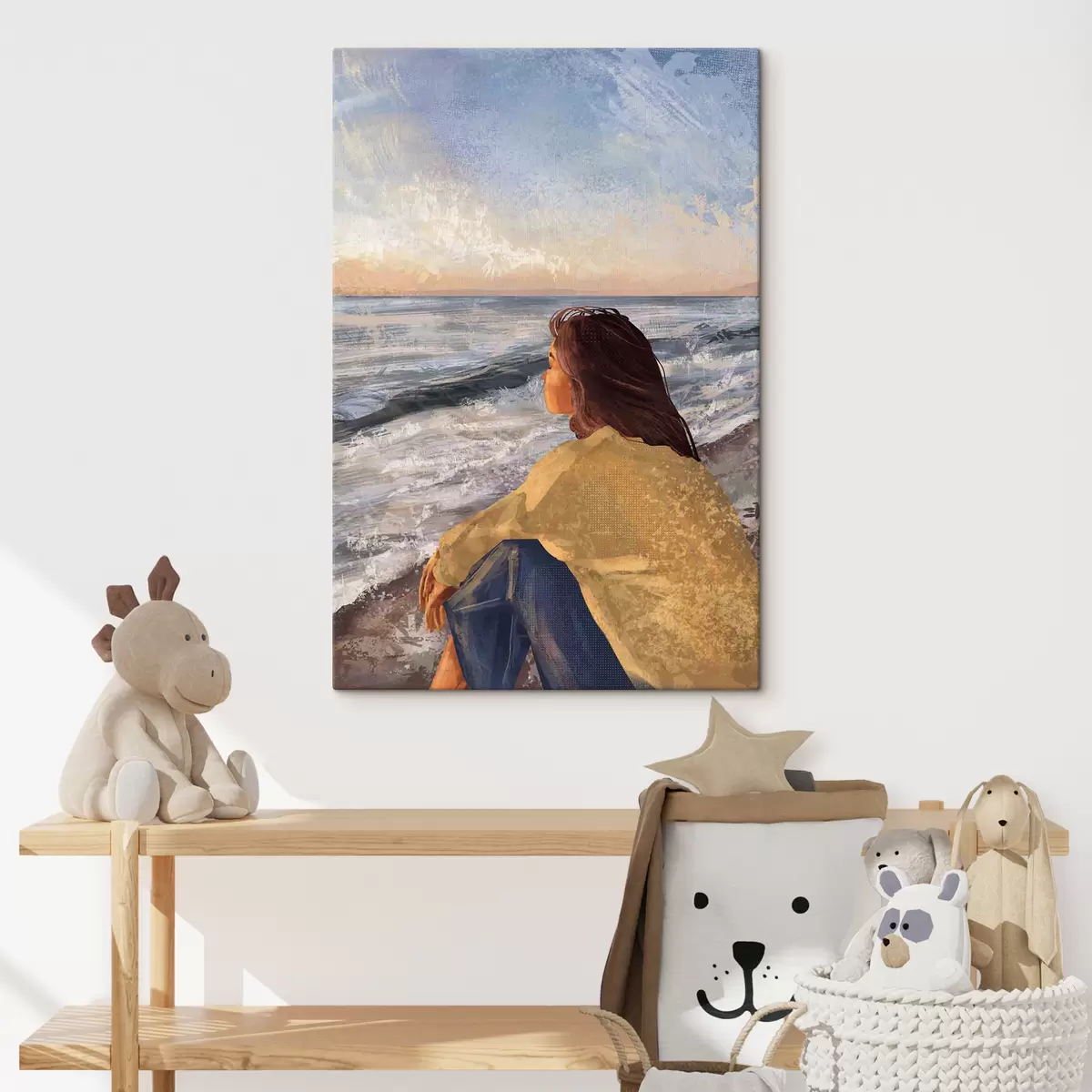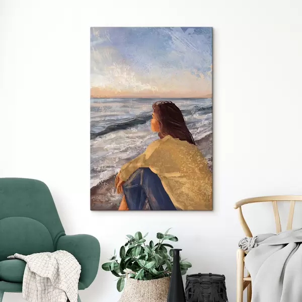 Schilderijen Vrouw aan zee die de golven overweegt s35317