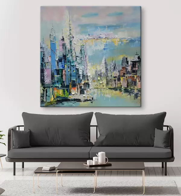 Het schilderij kan direct na ontvangst worden opgehangen. Het schilderij wordt opgespannen op een 2 cm breed houten spieraam.