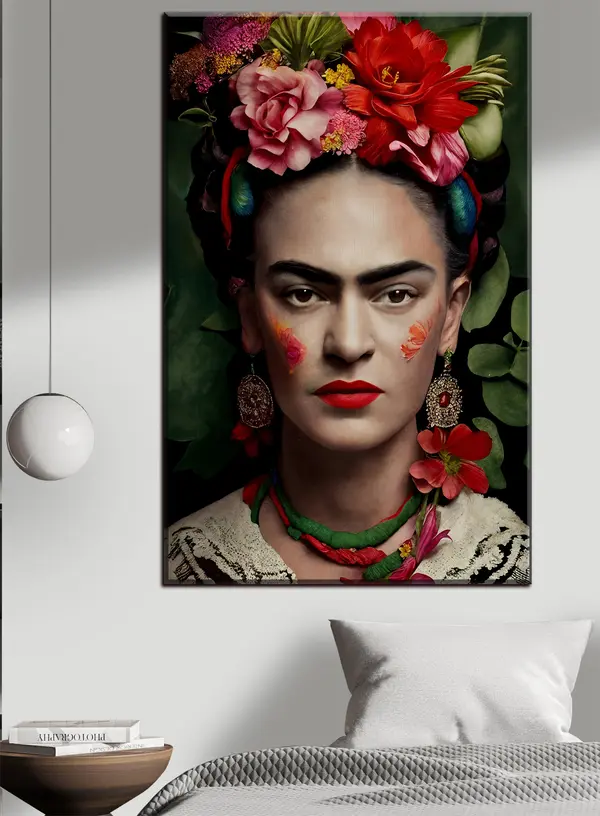 Schilderij Frida Kahlo met bloemen op groene achtergrond Art. s32861