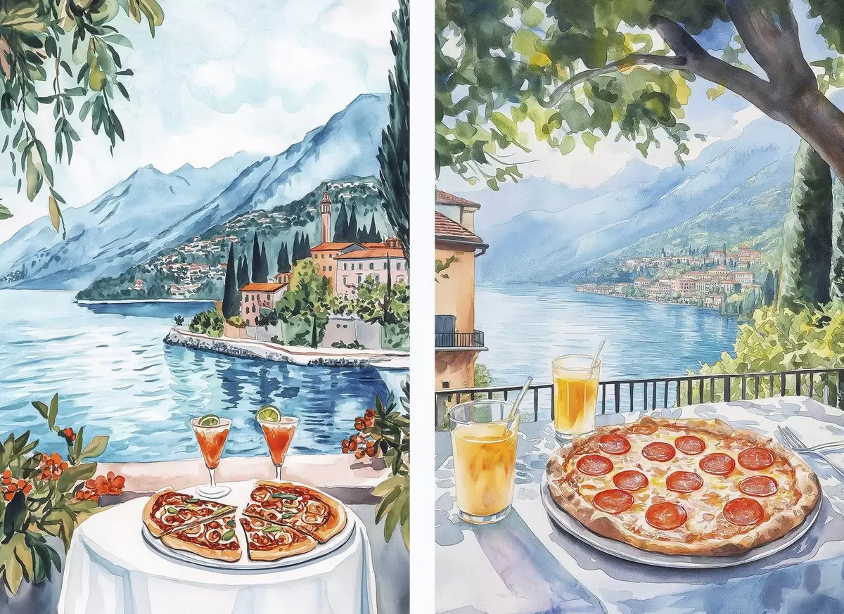 Schilderijen Comomeer, brunch in Italië, aquarelstijl, pizza margarita, zomernatuur m00406