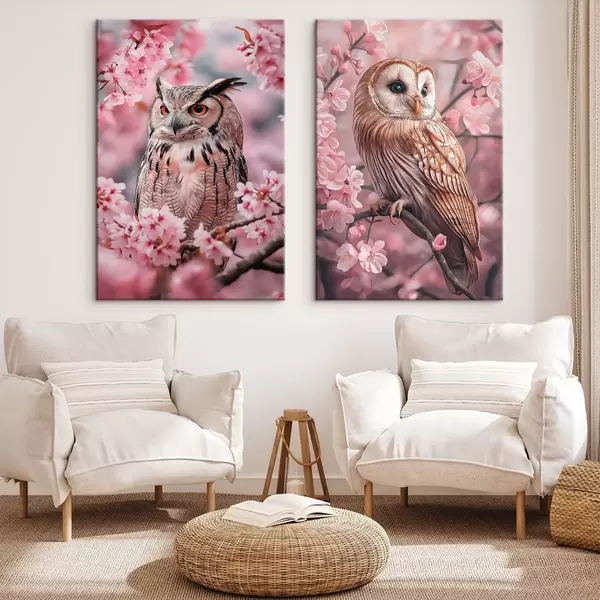Schilderijen Uilen op de kersenboom, roze bloemen, realisme, natuur m00411