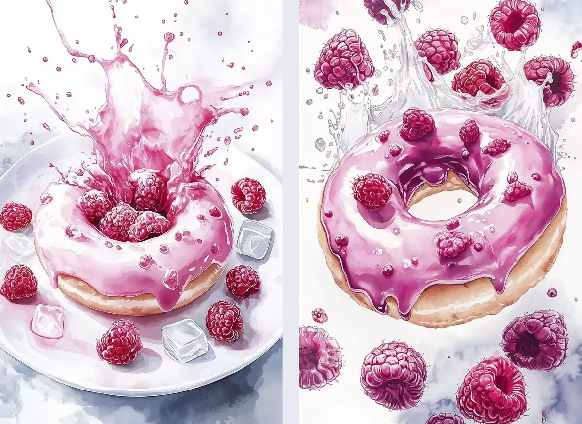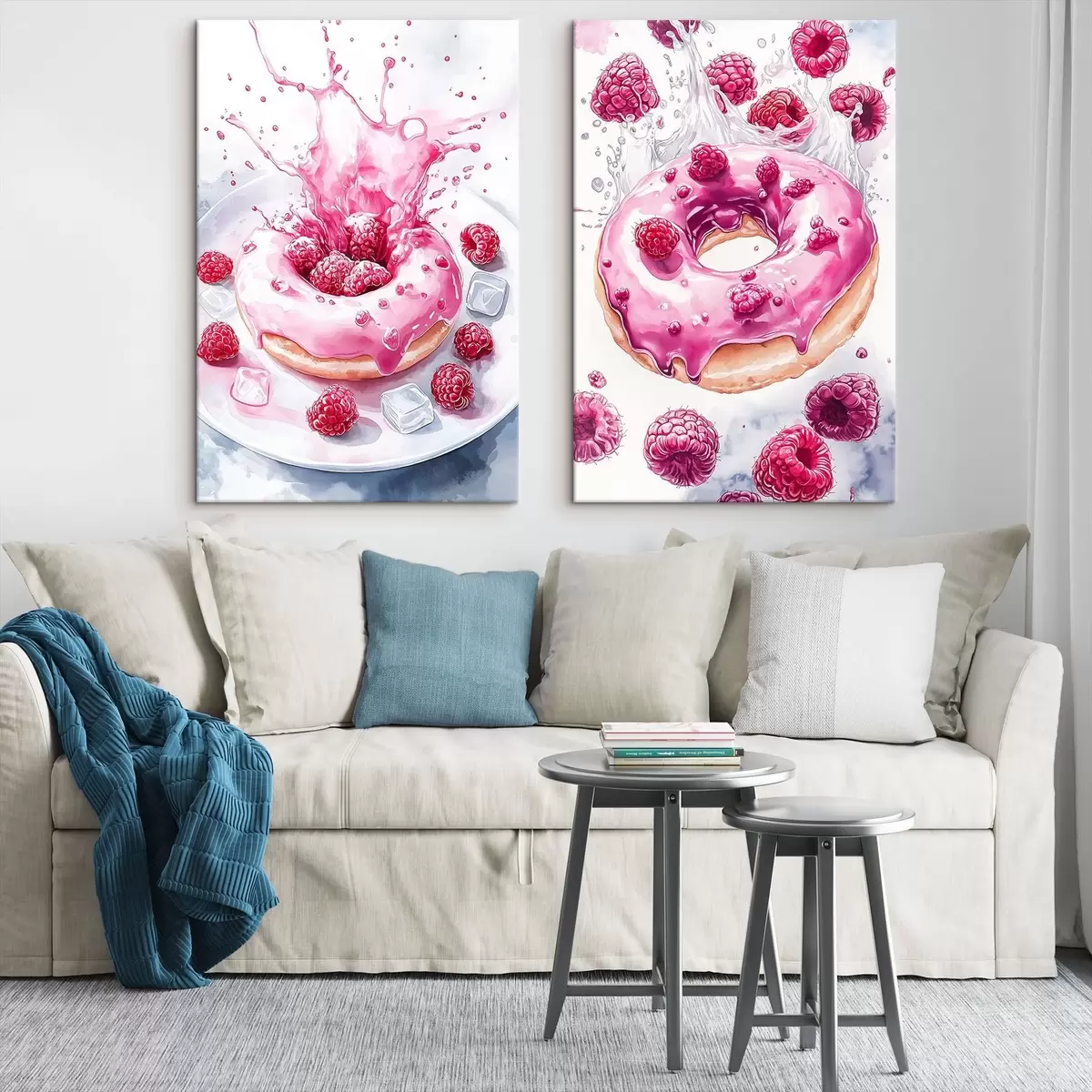 Schilderij Heerlijke donuts in aquarelstijl met frambozen, roze kleuren Art. m00412