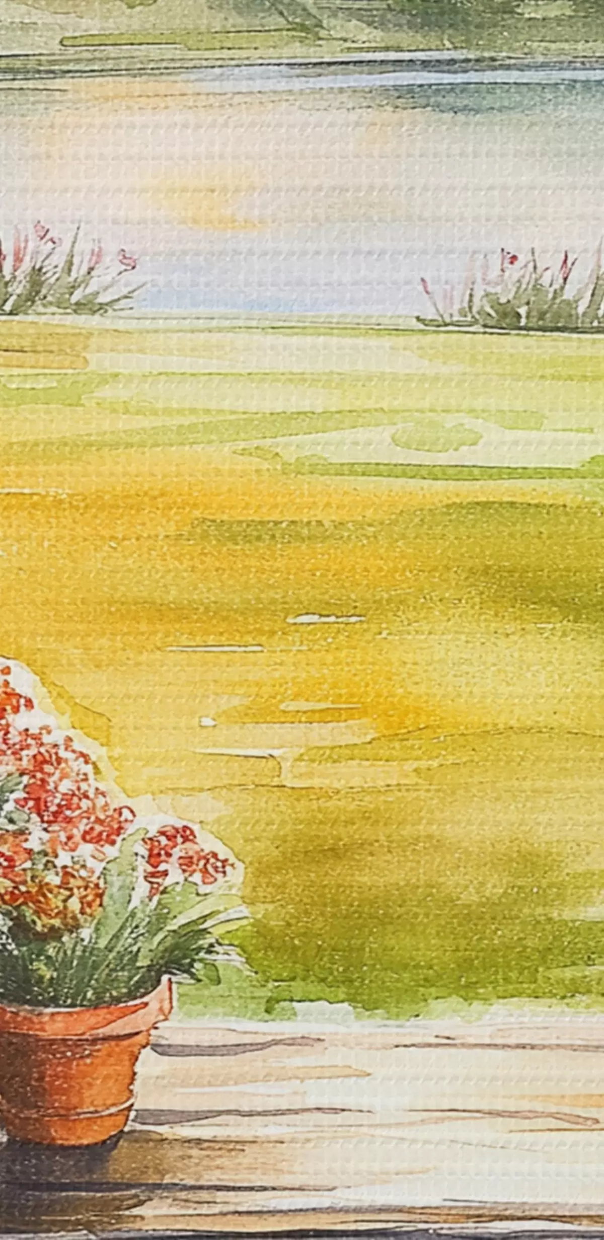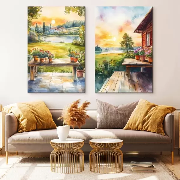 Schilderijen Zomerdorp, zonsondergang, rustiek, bloemen, meer, aquarel stijl m00449