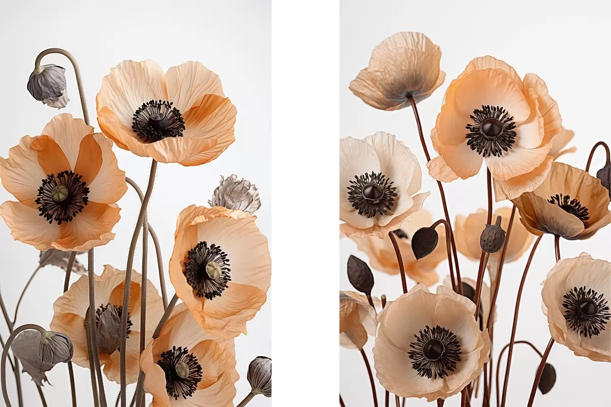 Schilderij Oranje klaprozen, gedroogde bloemen tegen een lichte achtergrond, zachte verlichting, delicate bloemblaadjes, bloemstuk Art. m00518