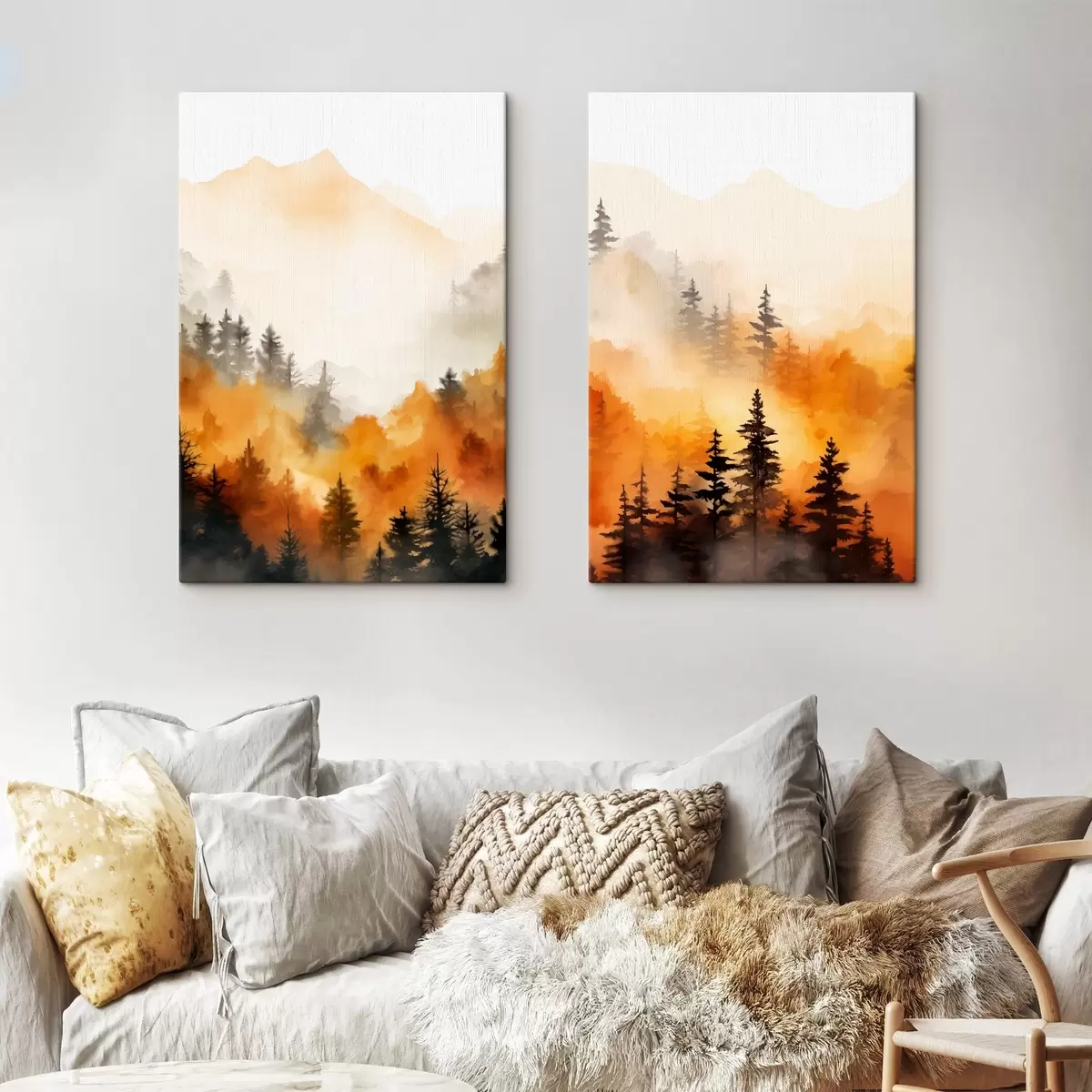 Schilderij Een landschap aquarel imitatie van een bos met hoge pijnbomen en bergen op de achtergrond Art. m00519