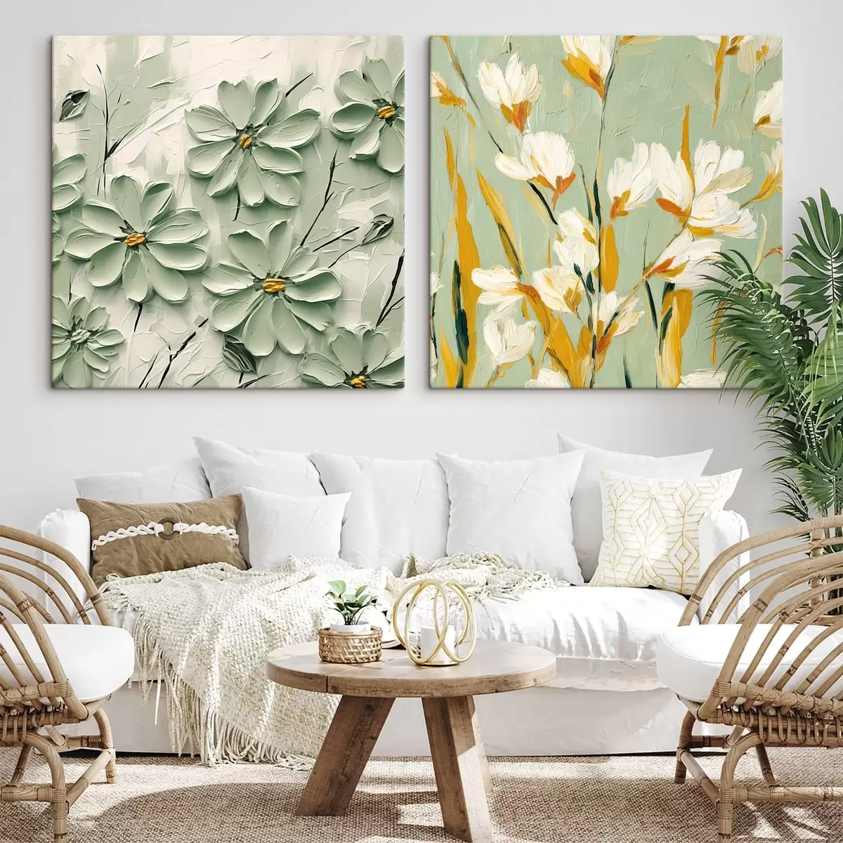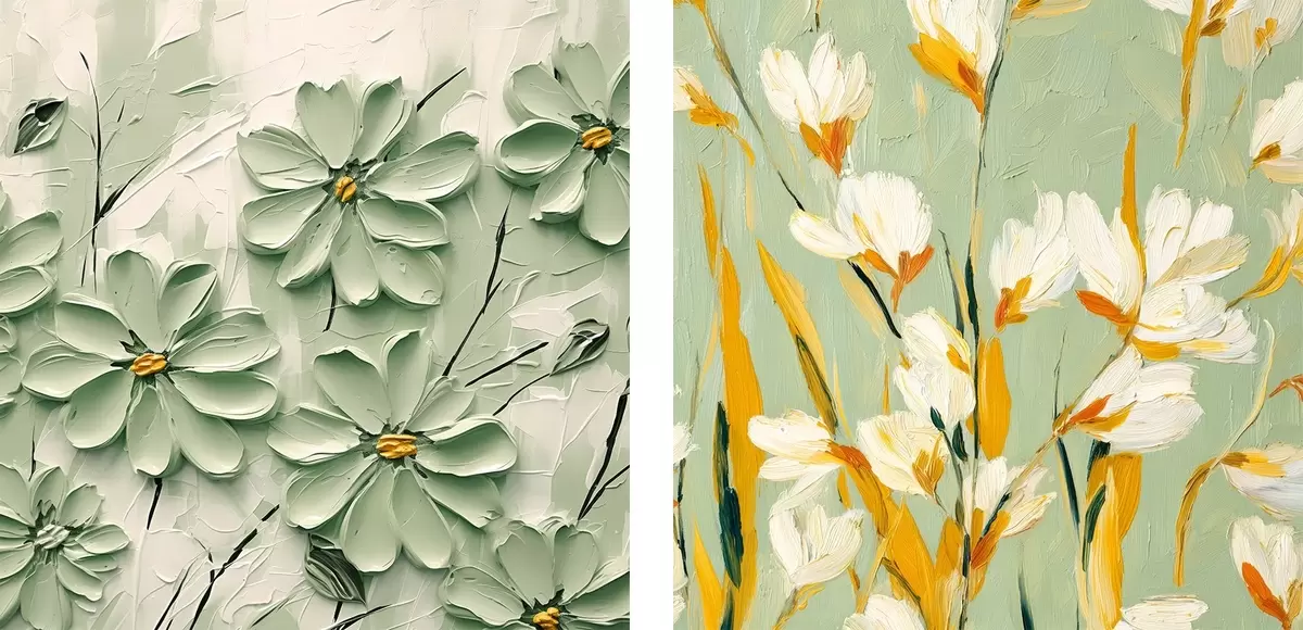 Schilderij Bloemenweide: kunstcompositie met volumetrische bloemen op een pastelachtergrond Art. m00567