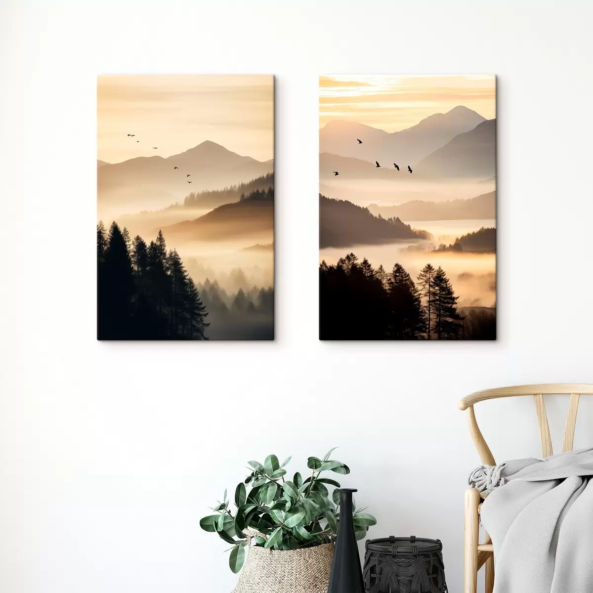 Schilderij Een berglandschap met een bos en vogels die in de lucht vliegen, alles bedekt met een dikke laag mist tijdens zonsopgang Art. m00651