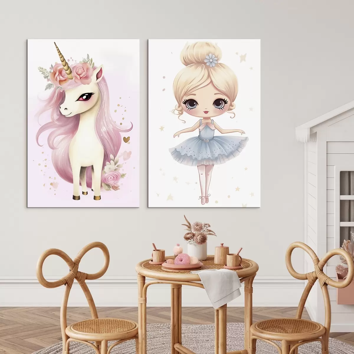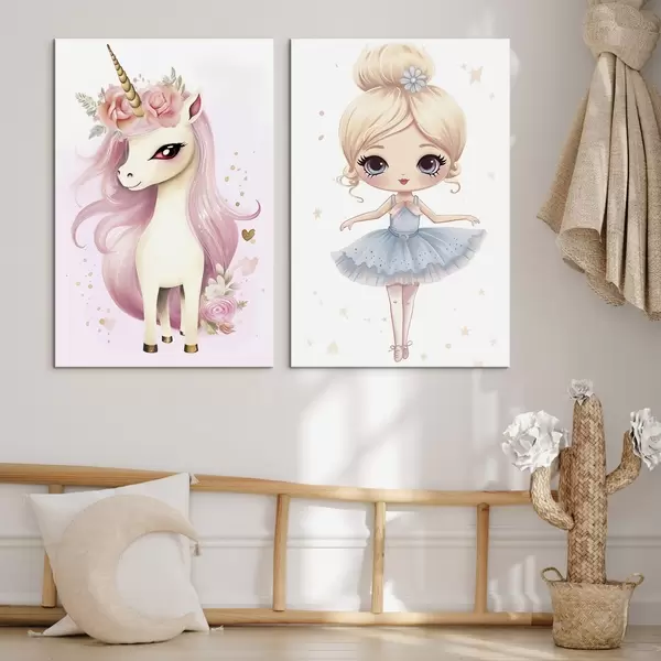 Schilderij Ballerina pop in een blauwe jurk en eenhoorn met roze manen Art. m00692