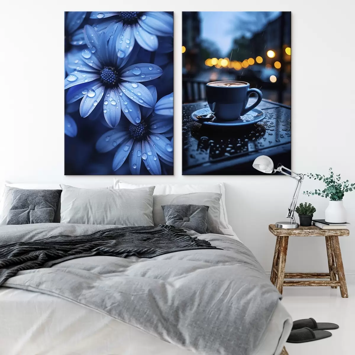 Schilderijen Blauwe bloemen met waterdruppels en een kopje koffie in de regen m00694