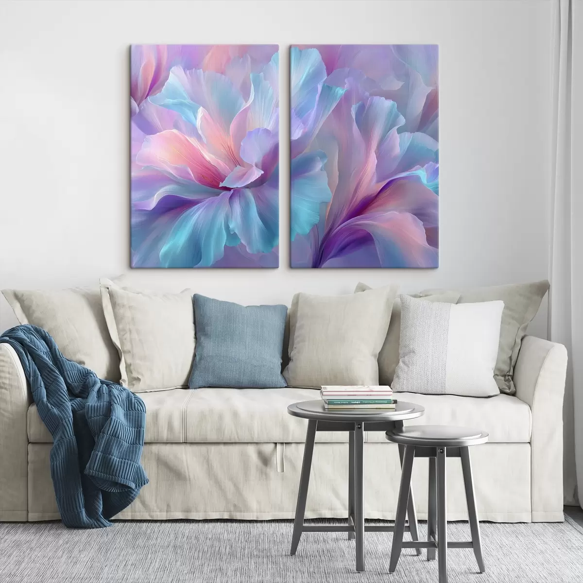 Schilderij een delicate fantasiebloem met bloemblaadjes in tinten paars, blauw en roze. Art. m00700