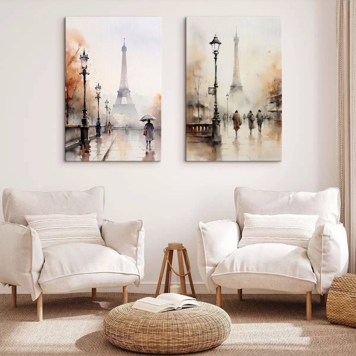 Schilderij Een regenachtige herfstdag in Parijs met de Eiffeltoren op de achtergrond en vintage straatlantaarns Art. m00821