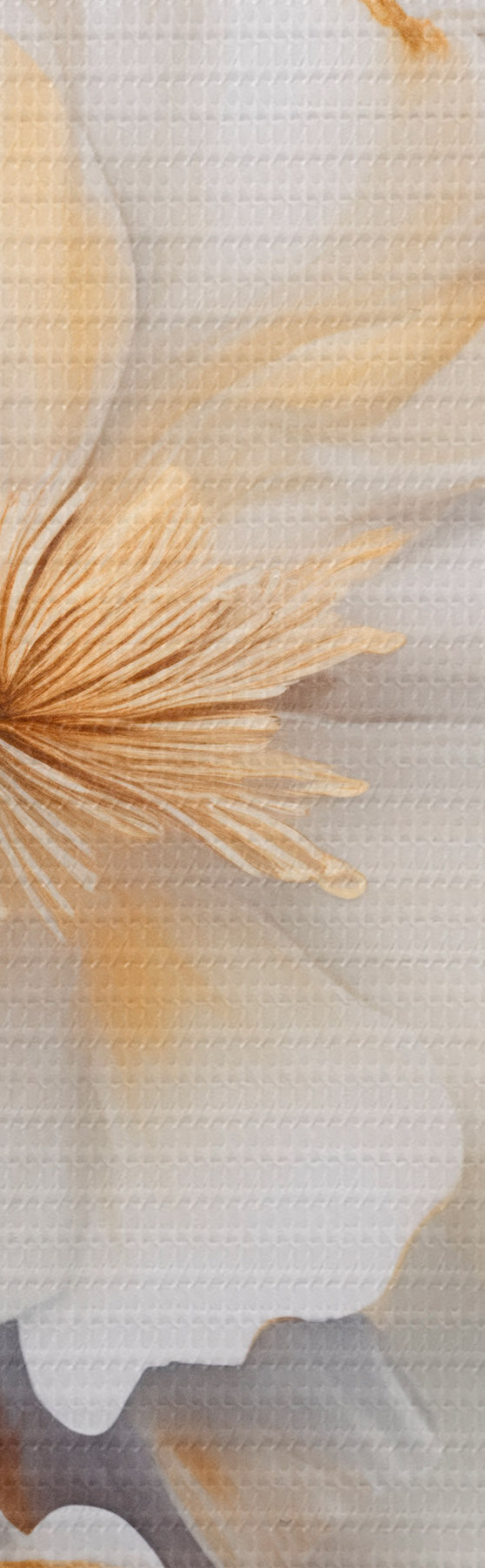 Schilderij Witte bloemen met gele details, bloemblaadjes met subtiele schaduwen, lichte achtergrond met subtiel marmereffect Art. m00889