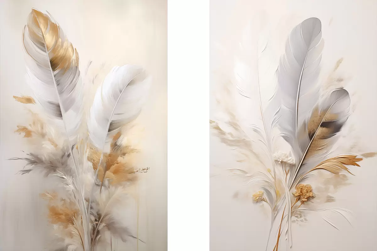 Schilderij Abstracte veren, omgeven door beige en bruine pluimen, zacht en delicaat, op een lichtbeige achtergrond Art. m01016