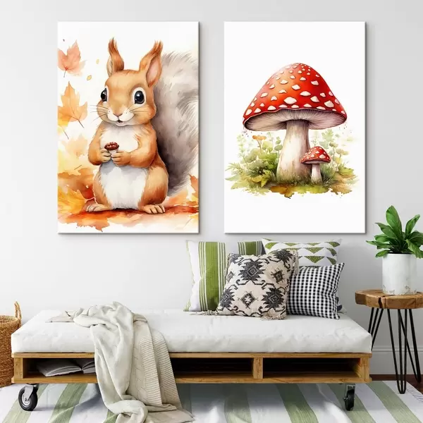 Schilderijen Eekhoorn en bospaddenstoel, vliegenzwam, imitatie-aquarel m01049