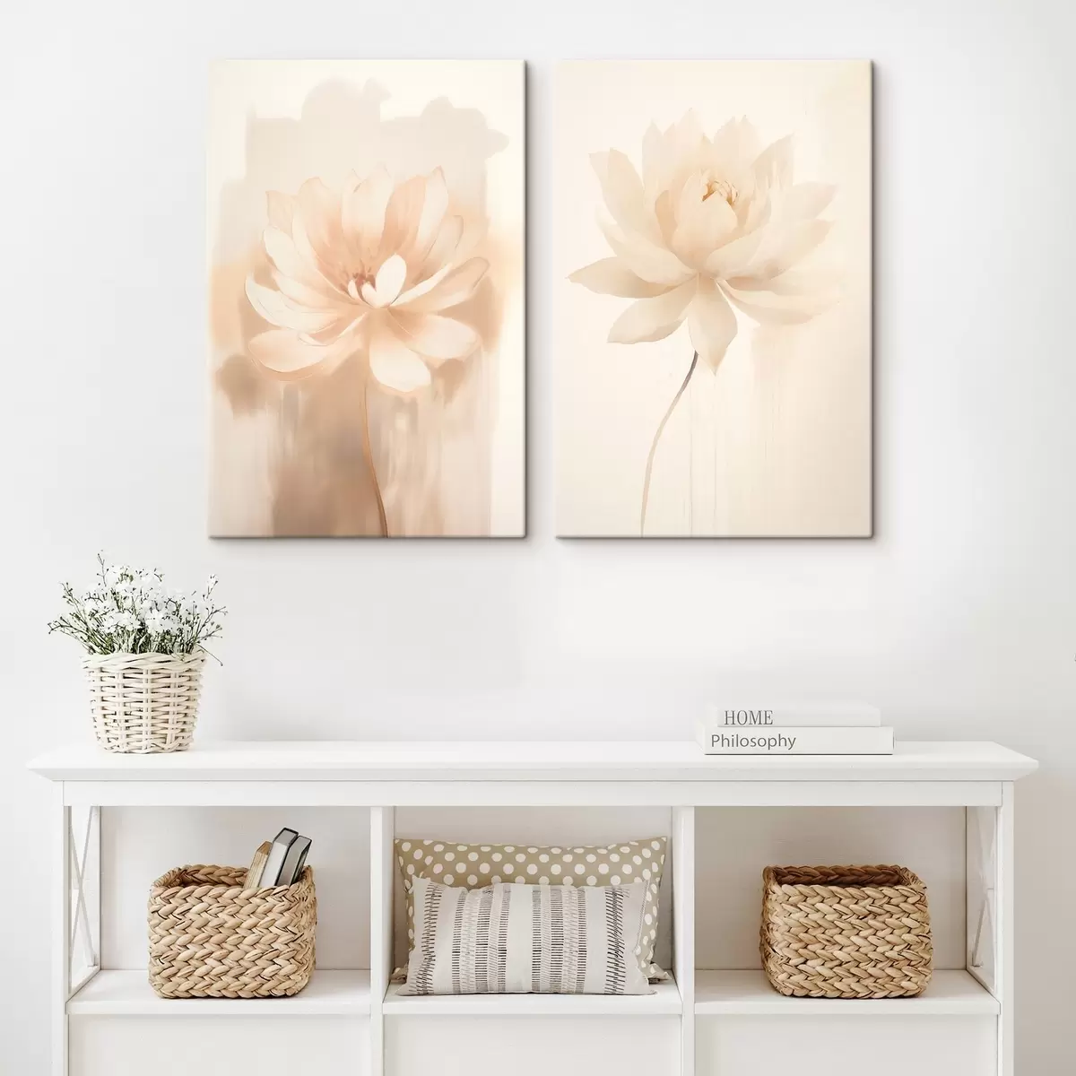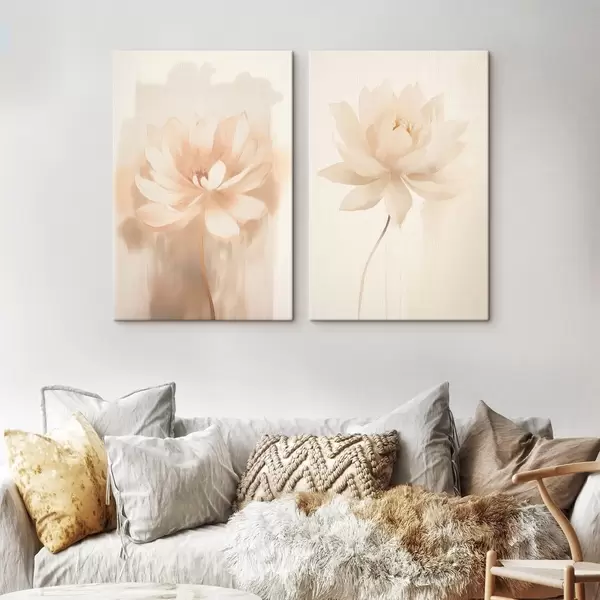 Schilderijen Bloemstuk in warme beigetinten met lichte penseelstreken en een luchtige achtergrond m01087
