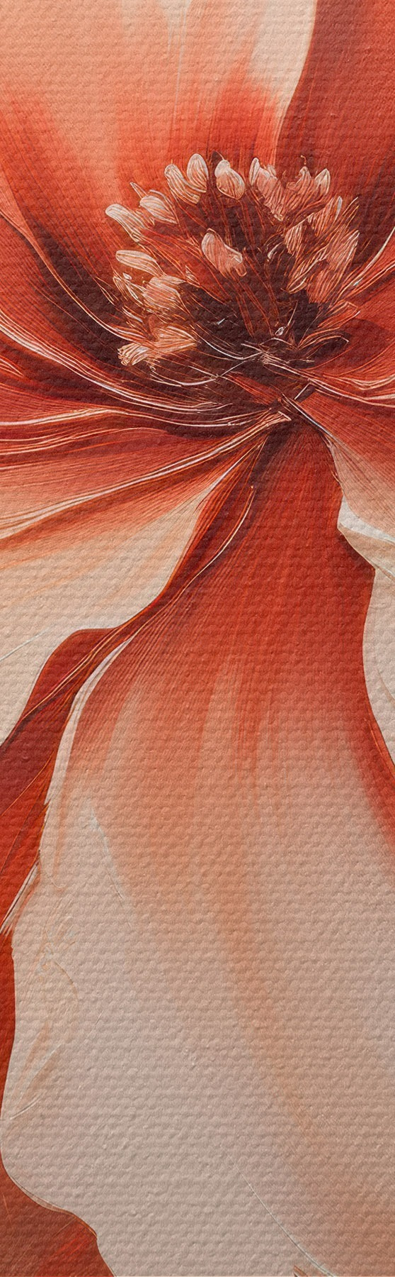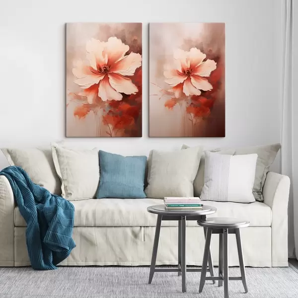 Schilderij Bloemensamenstelling: witte en crèmekleurige bloemblaadjes, koraalkleurige accenten en een zachte, mistige achtergrond Art. m01088