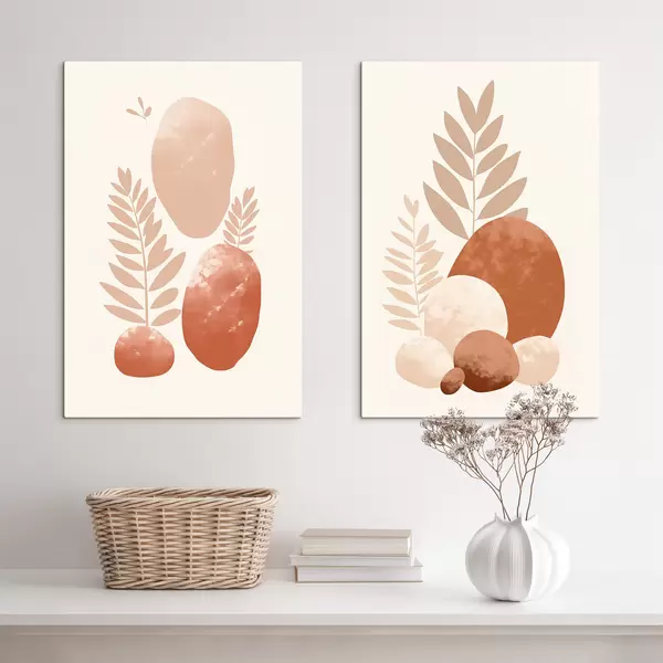 Schilderij Abstracte vormen, gestructureerde stenen en bladeren in gedempte perzik- en terracottatinten, minimalistisch, crèmekleurige achtergrond Art. m01114