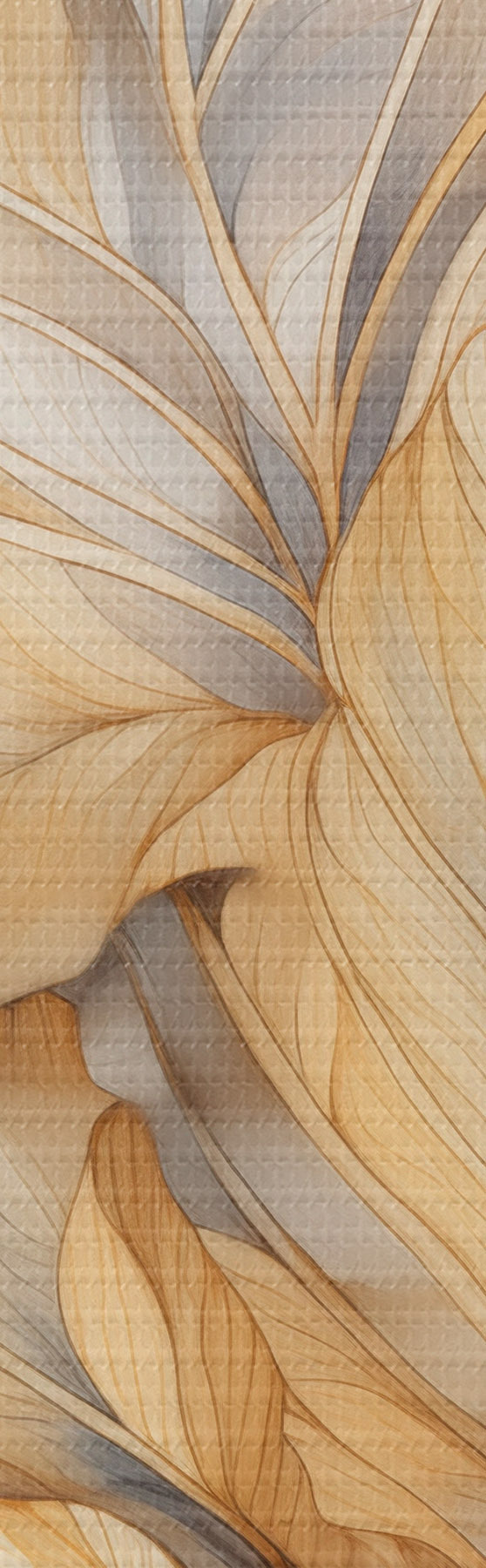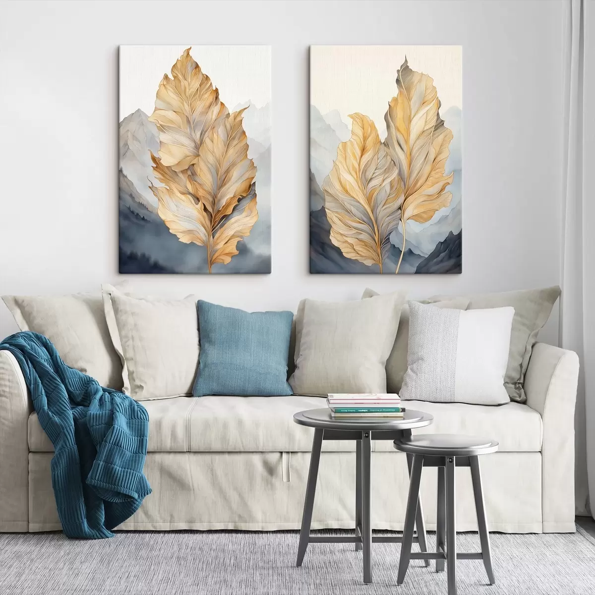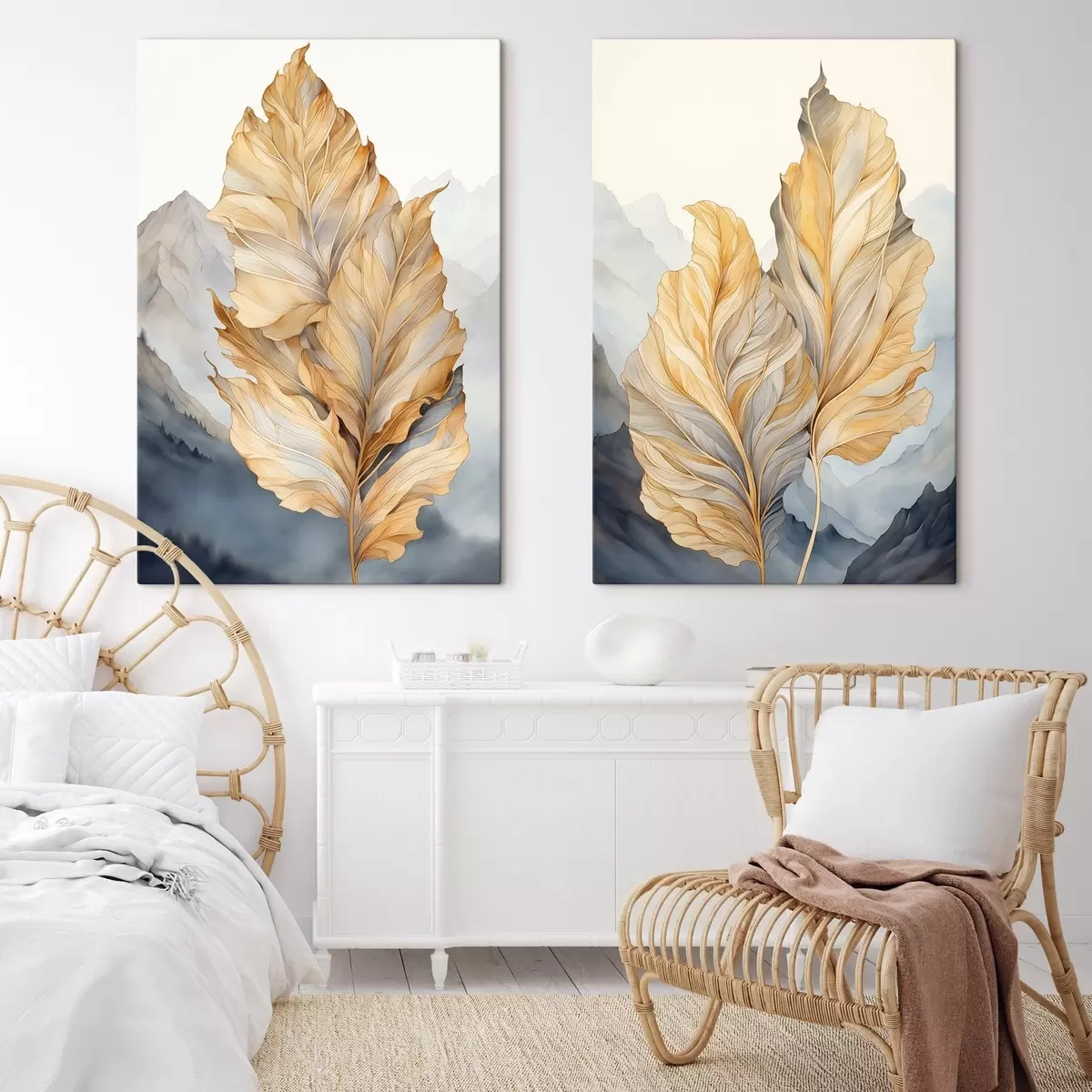 Schilderij Abstracte grote, gele en bruine bladeren met ingewikkelde details, tegen een berglandschap Art. m01119