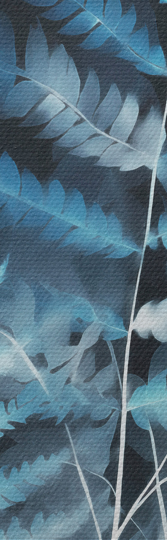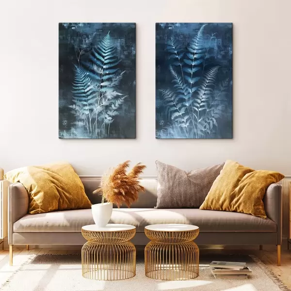 Schilderij Blauwe varens en planten tegen een donkere, gestructureerde achtergrond, met de nadruk op de ingewikkelde details, röntgeneffect Art. m01121
