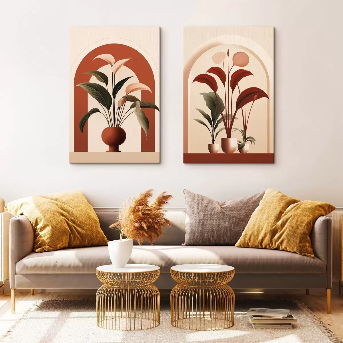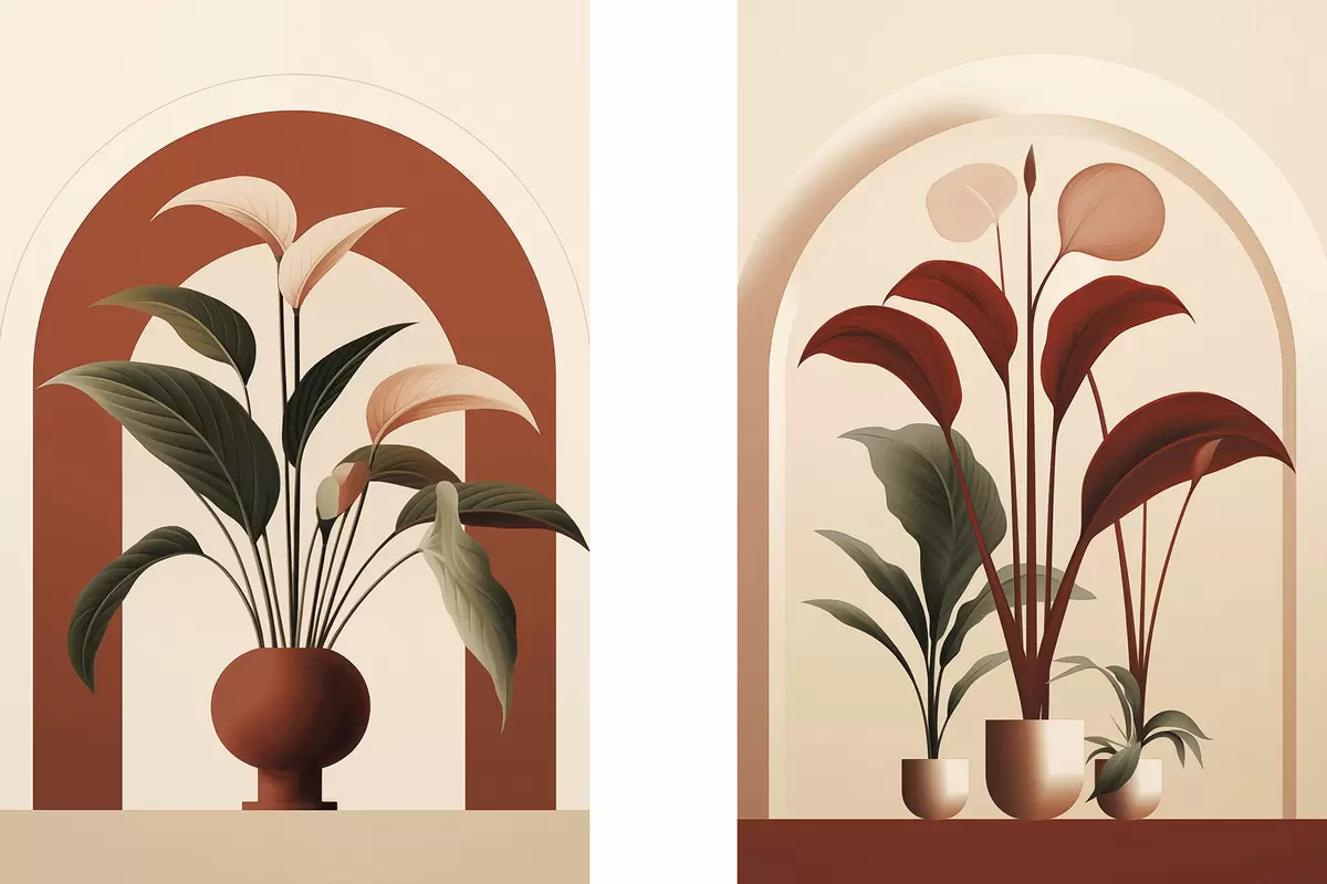 Schilderij Abstracte potplanten met grote groene en rode bladeren voor een crèmekleurige boog Art. m01124
