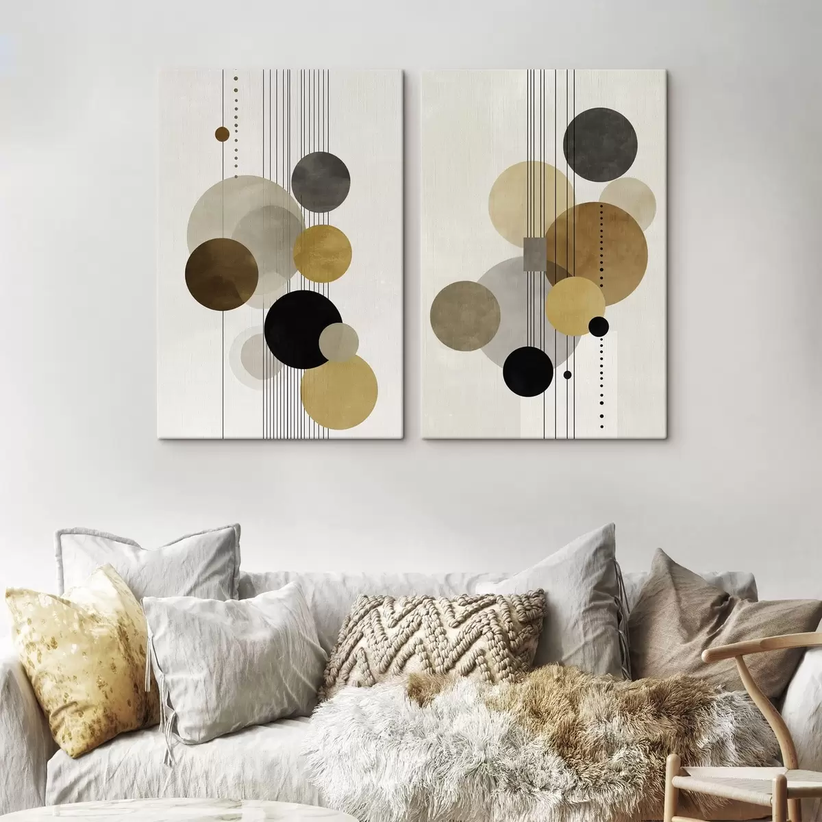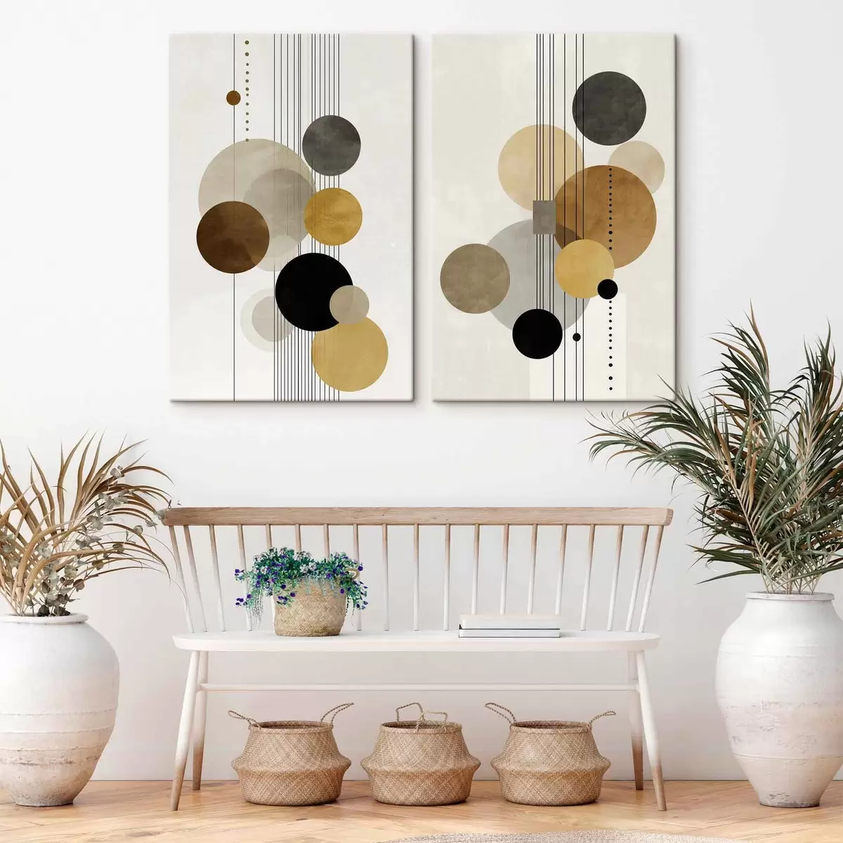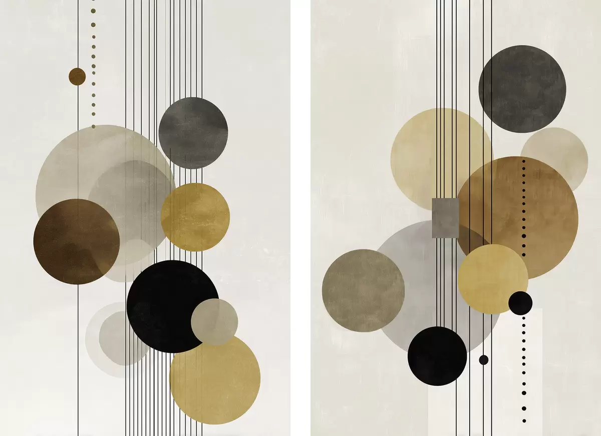 Schilderijen abstractie met cirkels en lijnen in warme kleuren m01182