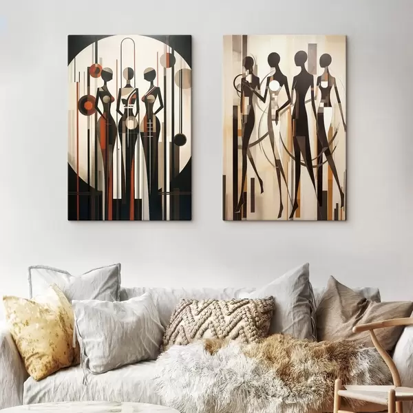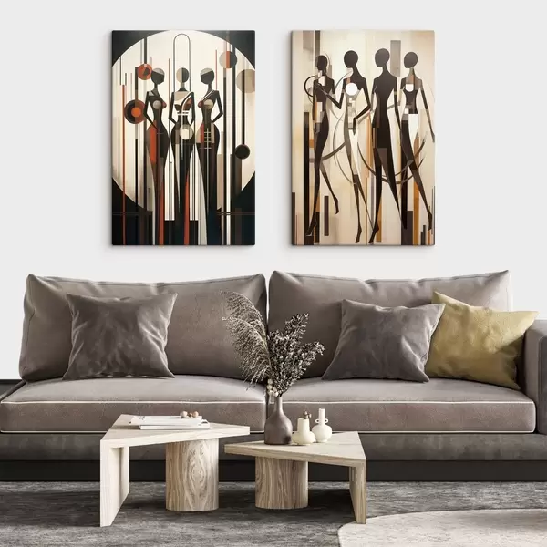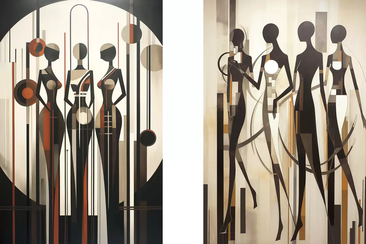 Schilderij Gestileerde vrouwelijke figuren met geometrische elementen tegen een abstracte achtergrond van verticale lijnen en cirkels Art. m01237