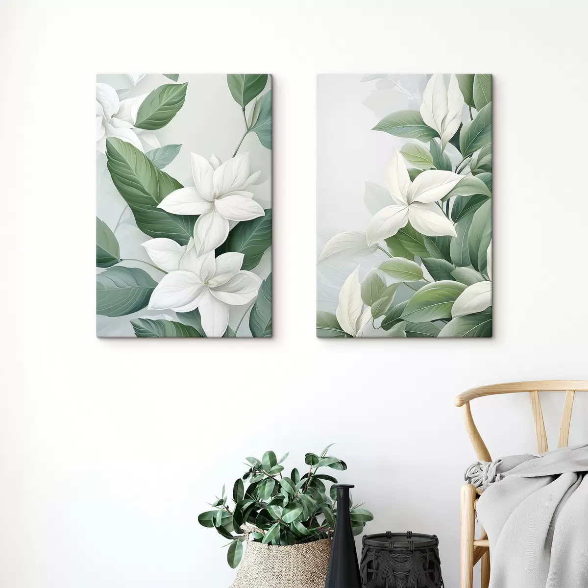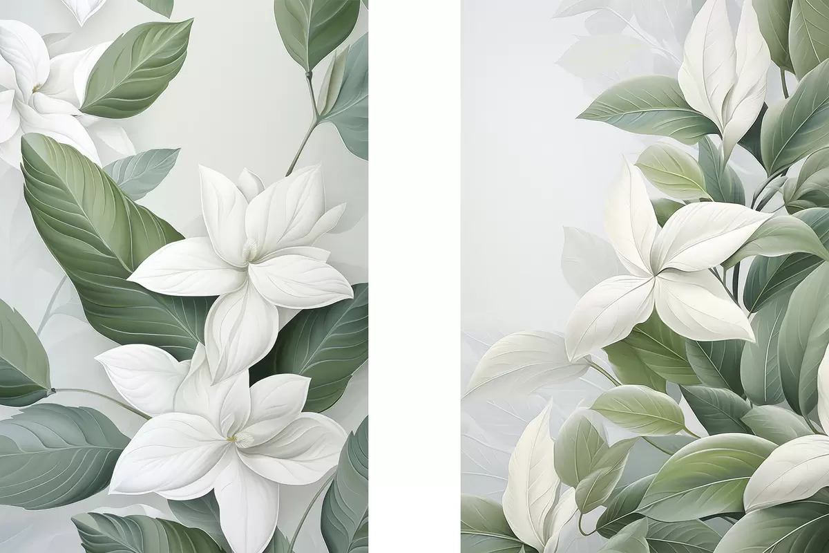 Schilderijen Witte bloemen met groene bladeren, pastelkleurige achtergrond m30055