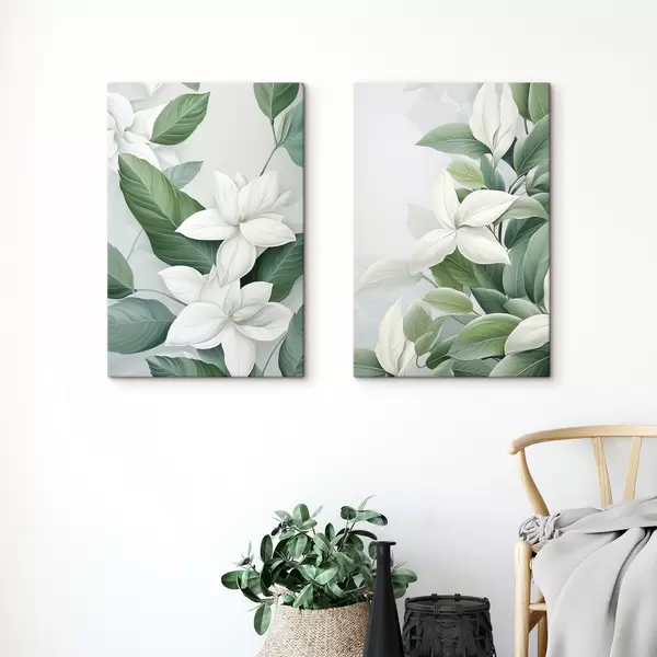 Schilderij Witte bloemen met groene bladeren, pastelkleurige achtergrond Art. m30055