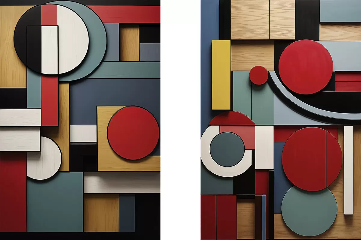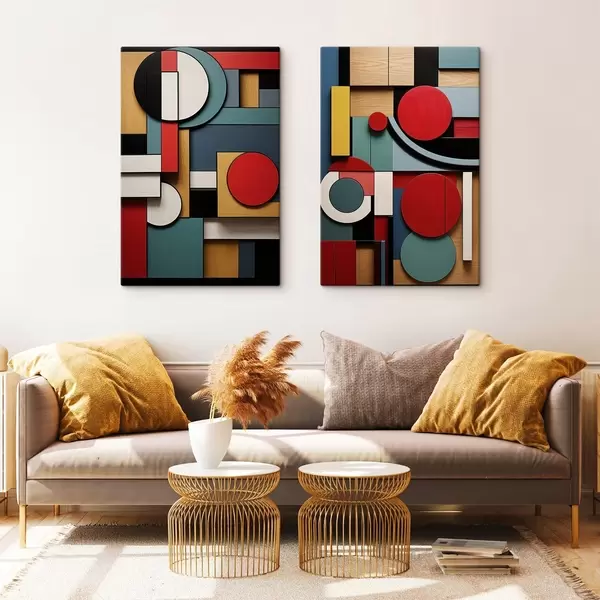Schilderij Abstracte geometrische compositie met imitatie van houtstructuur, rode, zwarte, witte en blauwgroene rechthoeken en cirkels Art. m30058