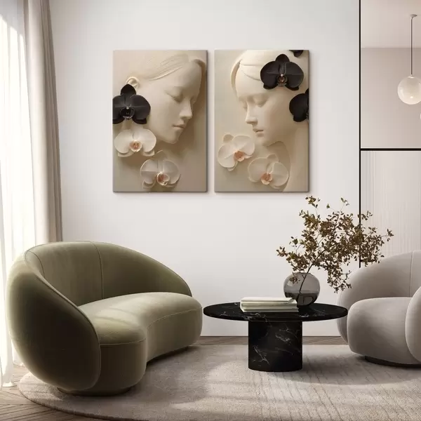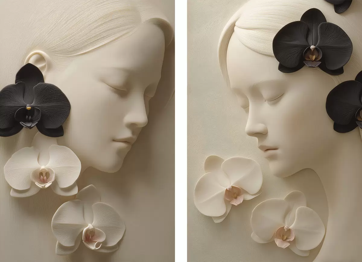 Schilderijen meisje met orchideeën in bas-reliëfstijl m30093