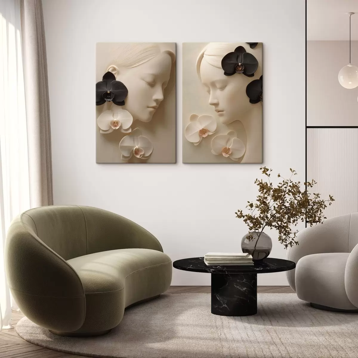 Schilderij meisje met orchideeën in bas-reliëfstijl Art. m30093