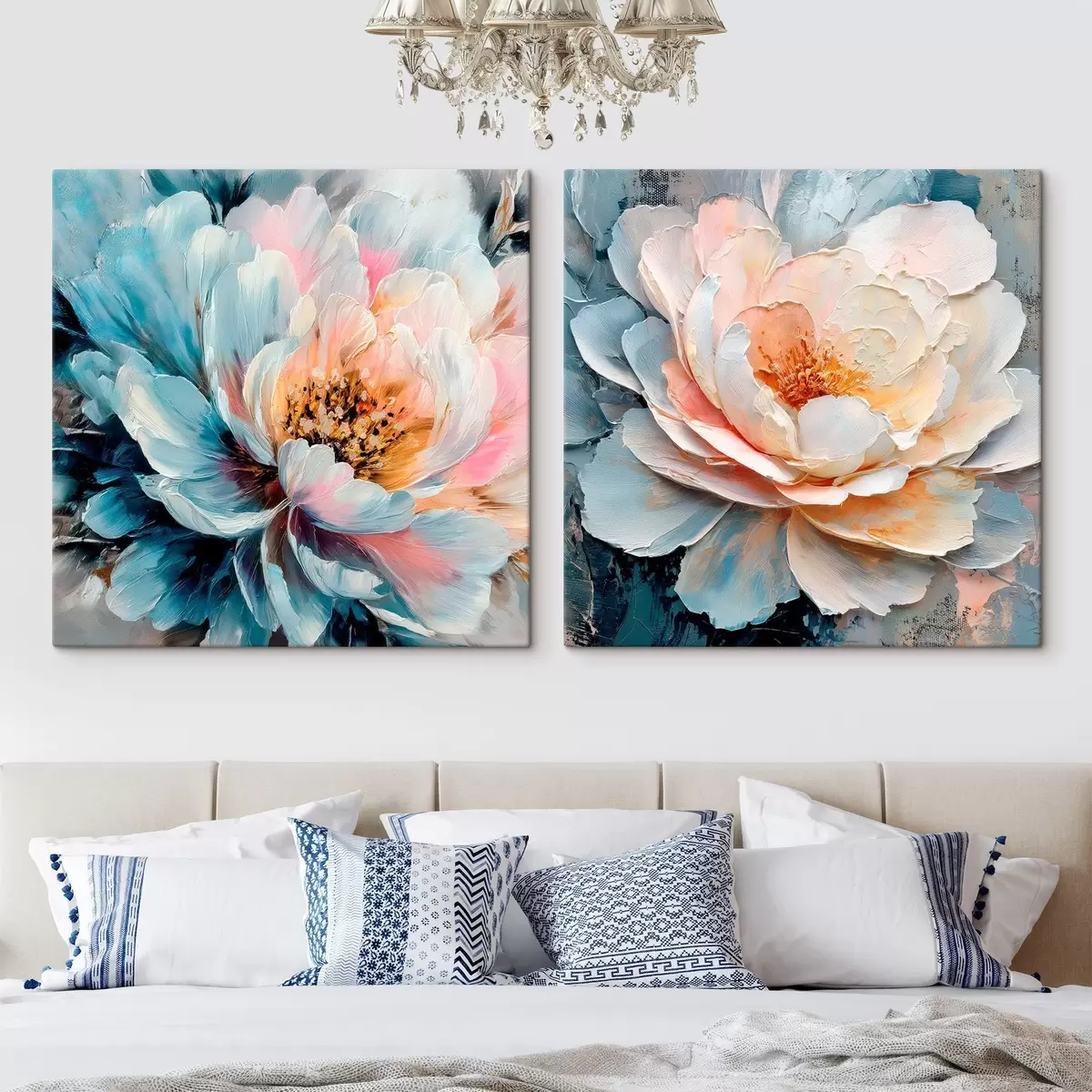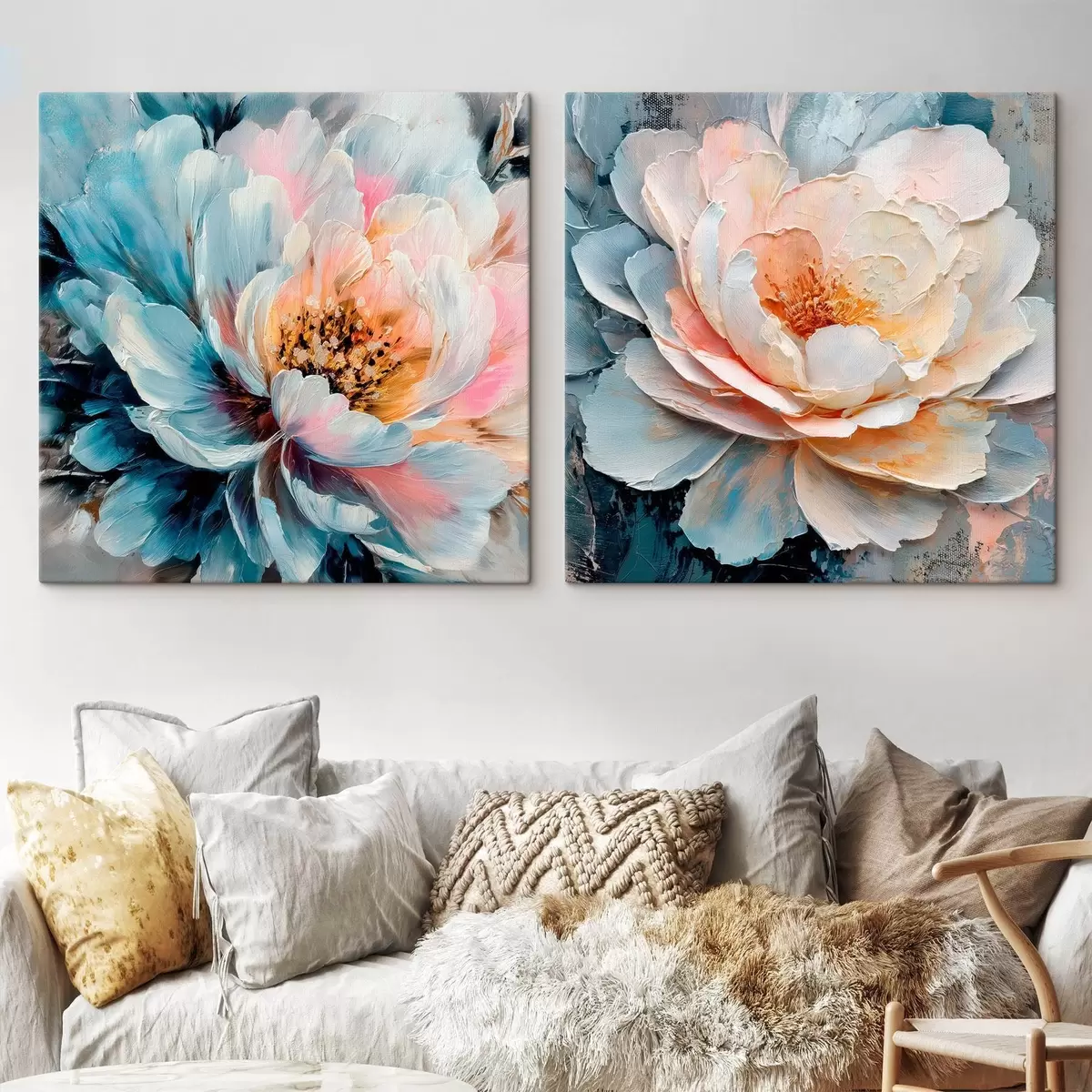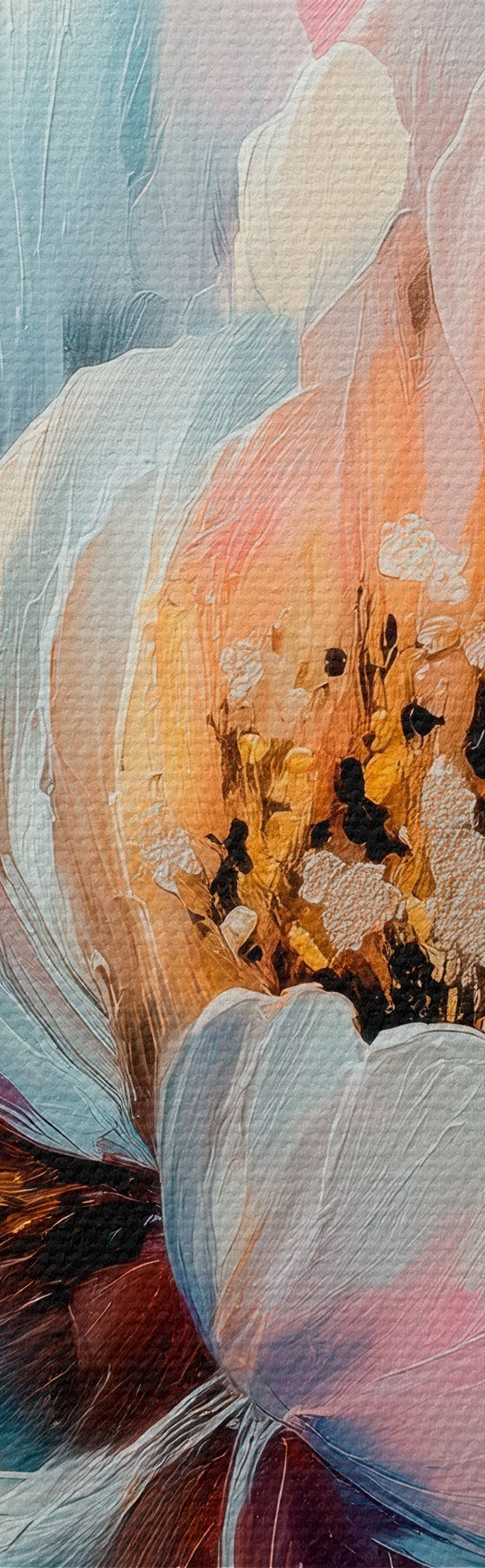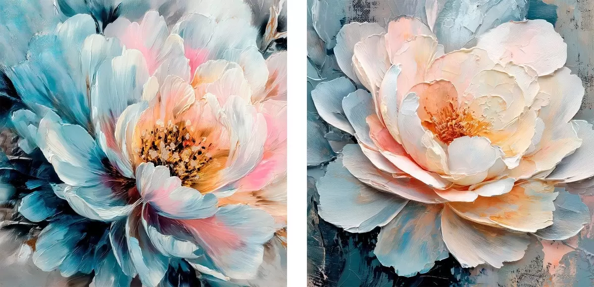 Schilderijen Abstracte bloemcompositie in een roze en blauw kleurenpalet met bloemblaadjes met textuur m30148