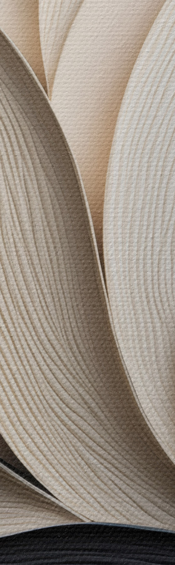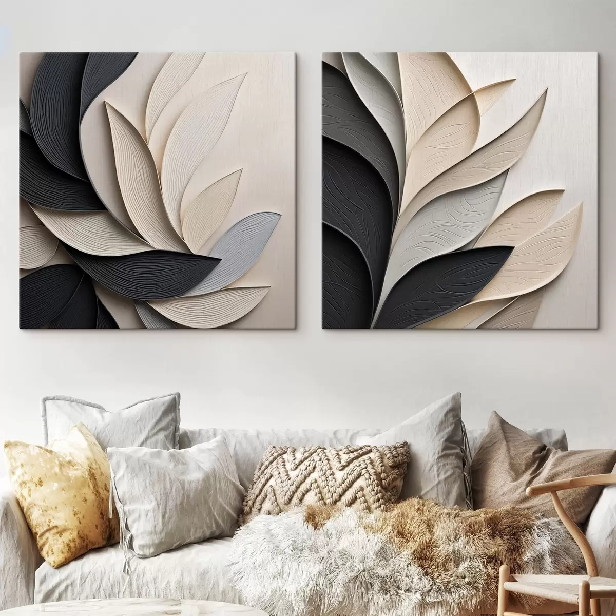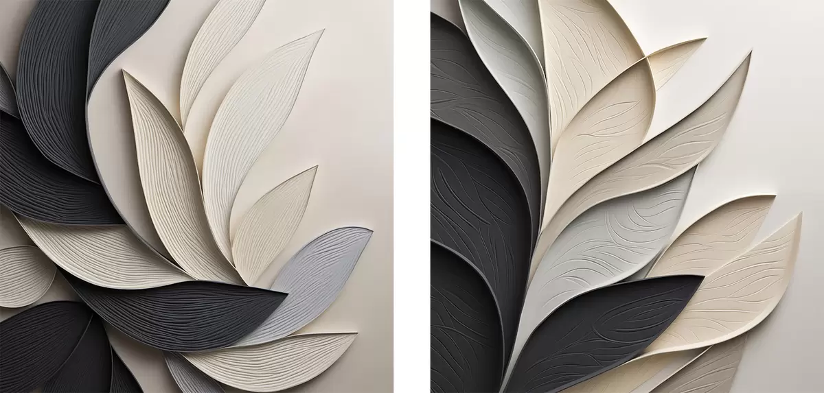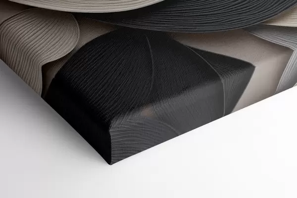 Schilderij Abstracte compositie van gelaagde bladeren, gebogen vormen in zwart, wit en beige, kunst met textuur Art. m30195