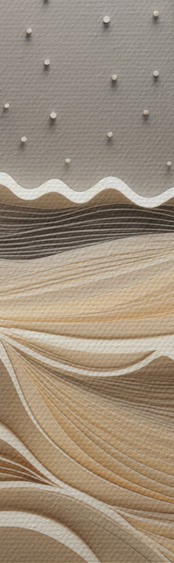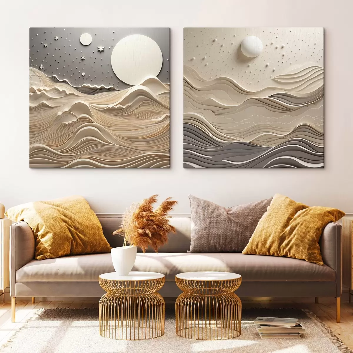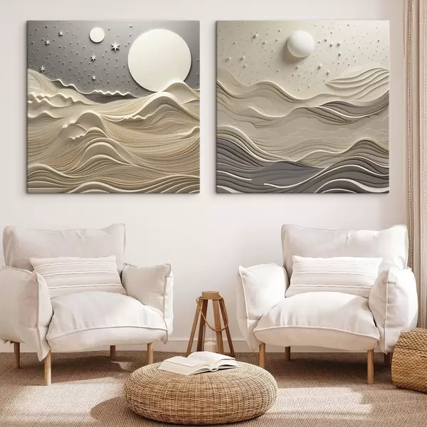 Schilderij Een minimalistisch, gestileerd landschap met glooiende heuvels en een grote maan aan een sterrenhemel, abstracte kunst Art. m30205