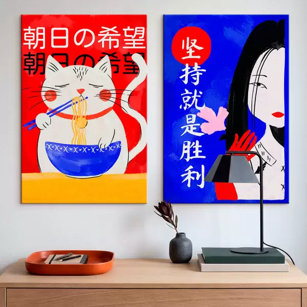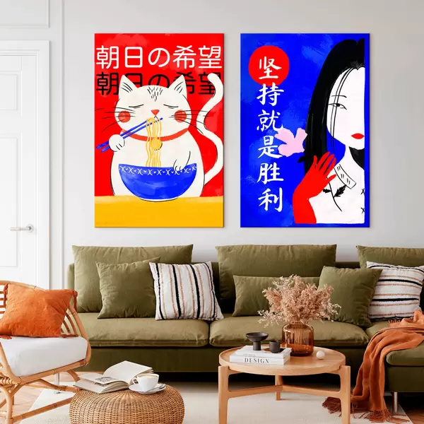 Schilderij Tweeluik met een kat en een vrouwenportret in een gedurfde stijl Art. m30233