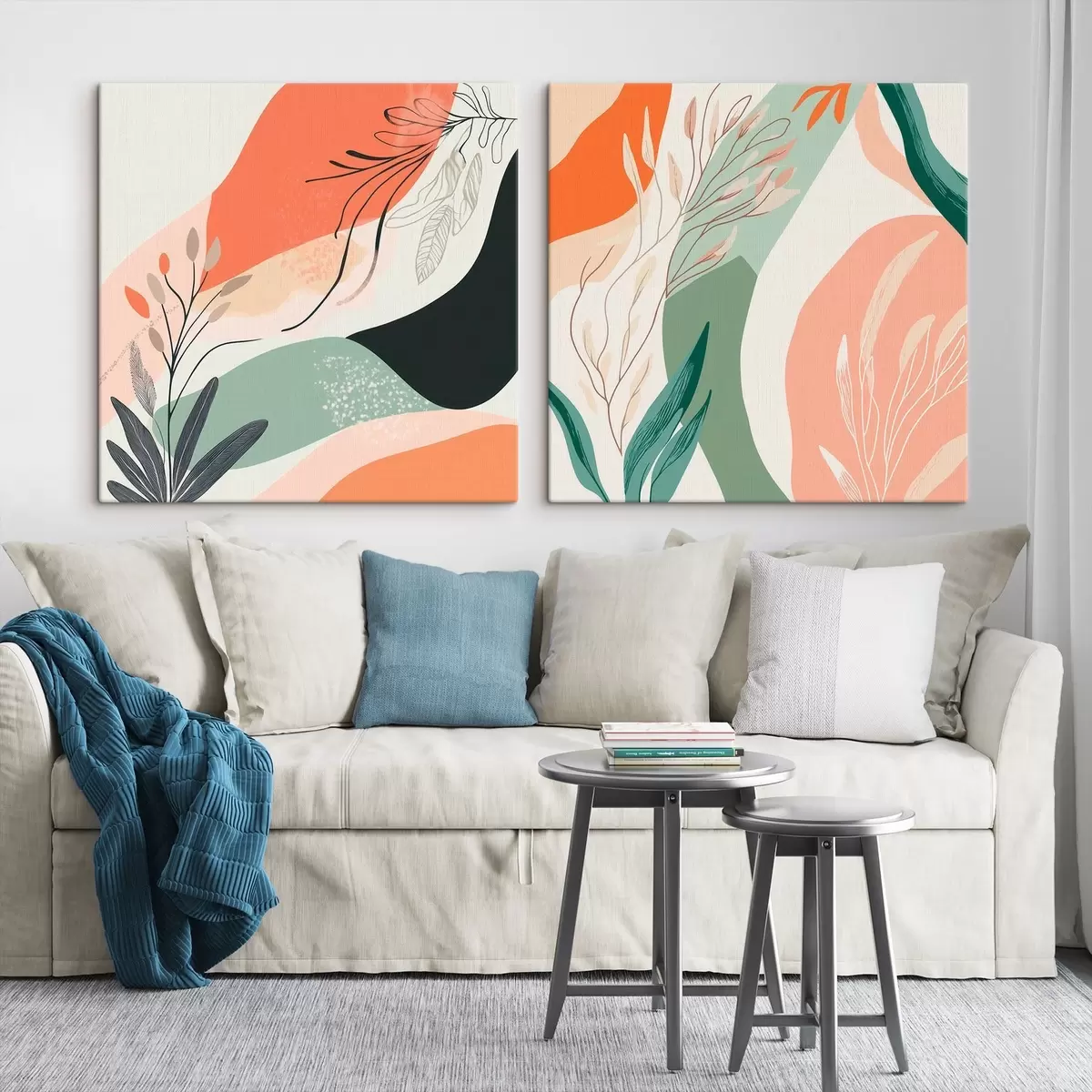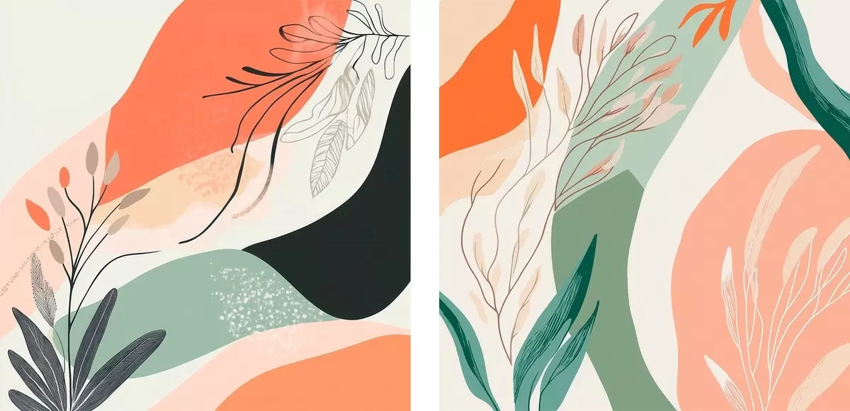Schilderij Abstract tweeluik met plantmotieven en kleurvlakken in een moderne stijl Art. m30347