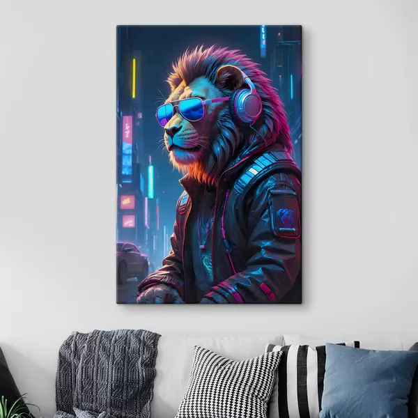 Schilderij Stijlvolle leeuw in futuristisch stadslandschap Art. s38169