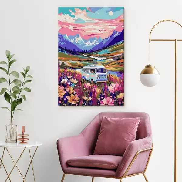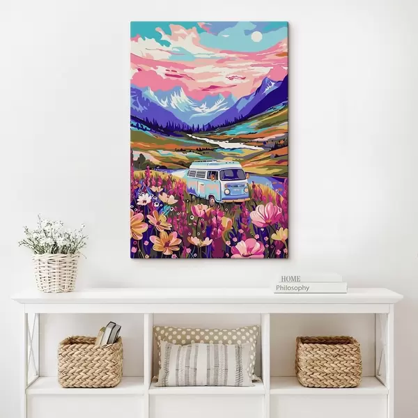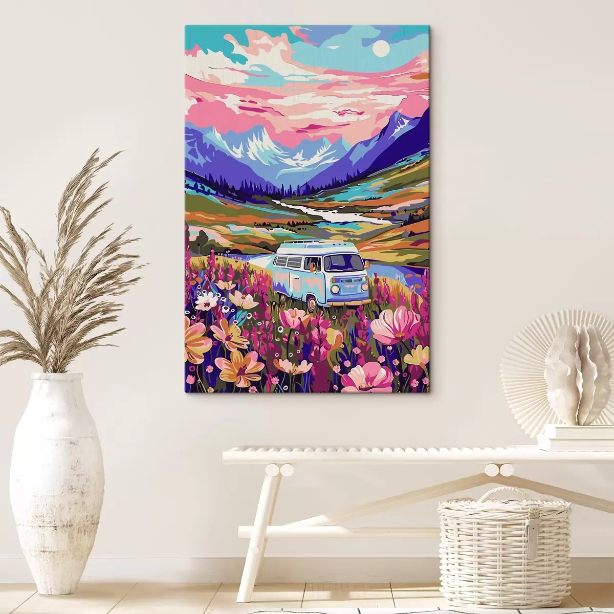 Schilderij Een busje rijdt door een bloemenveld Art. s38260