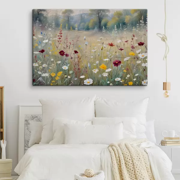 Schilderij Een kleurrijke weide met wilde bloemen met een wazig bos op de achtergrond Art. s38368