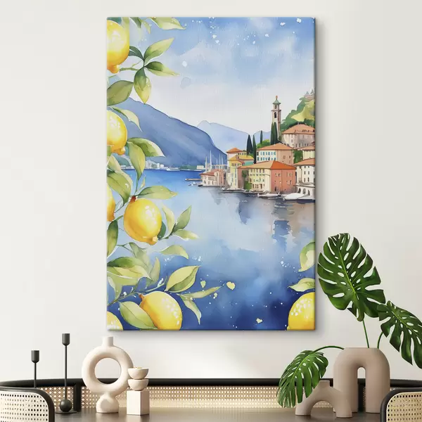 Schilderij Italiaans meer, zomer, aquarel, natuurlandschap, citroenen, stadsarchitectuur Art. s38397